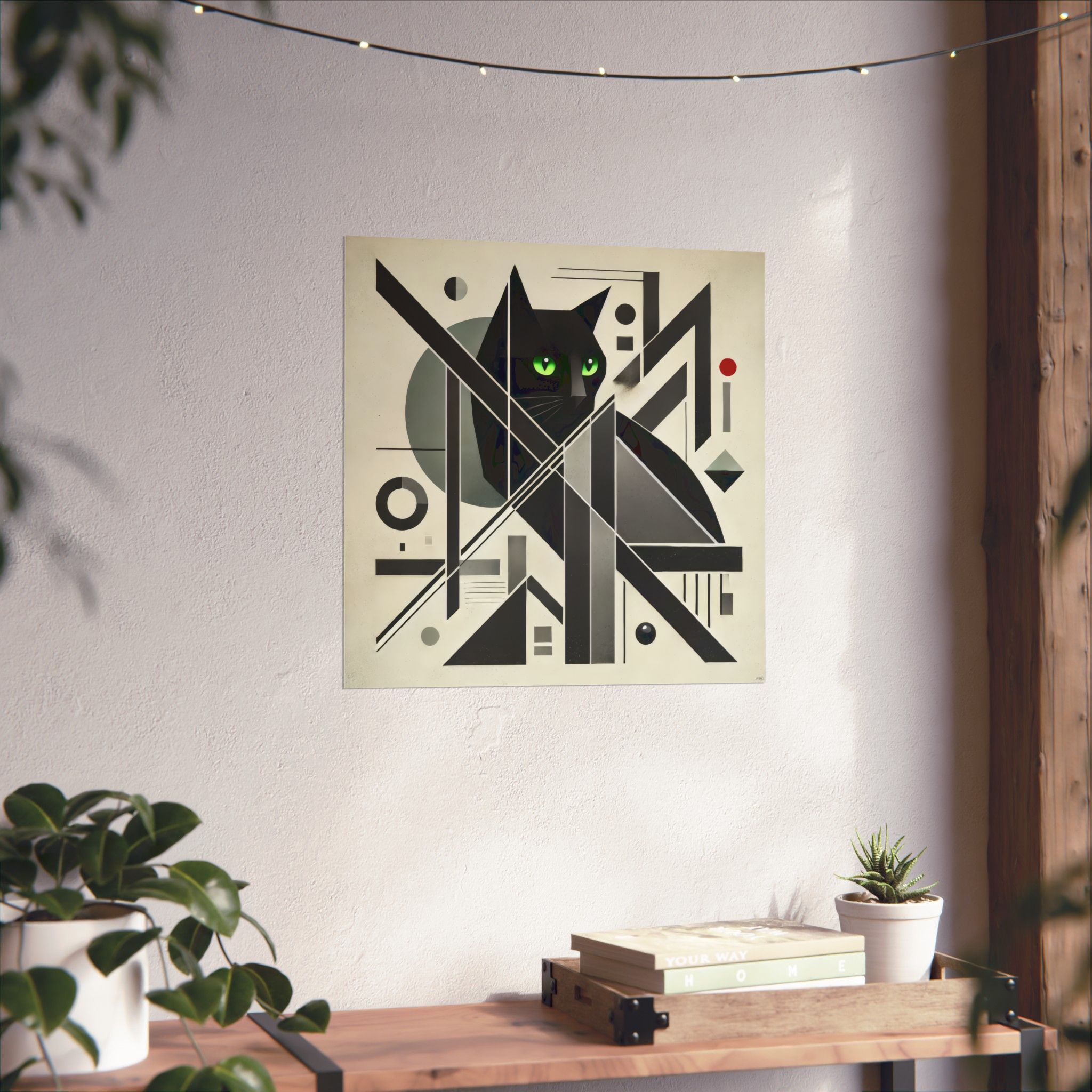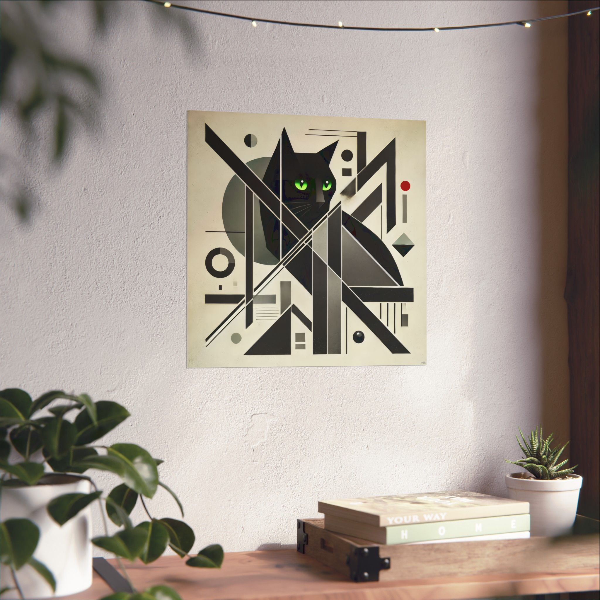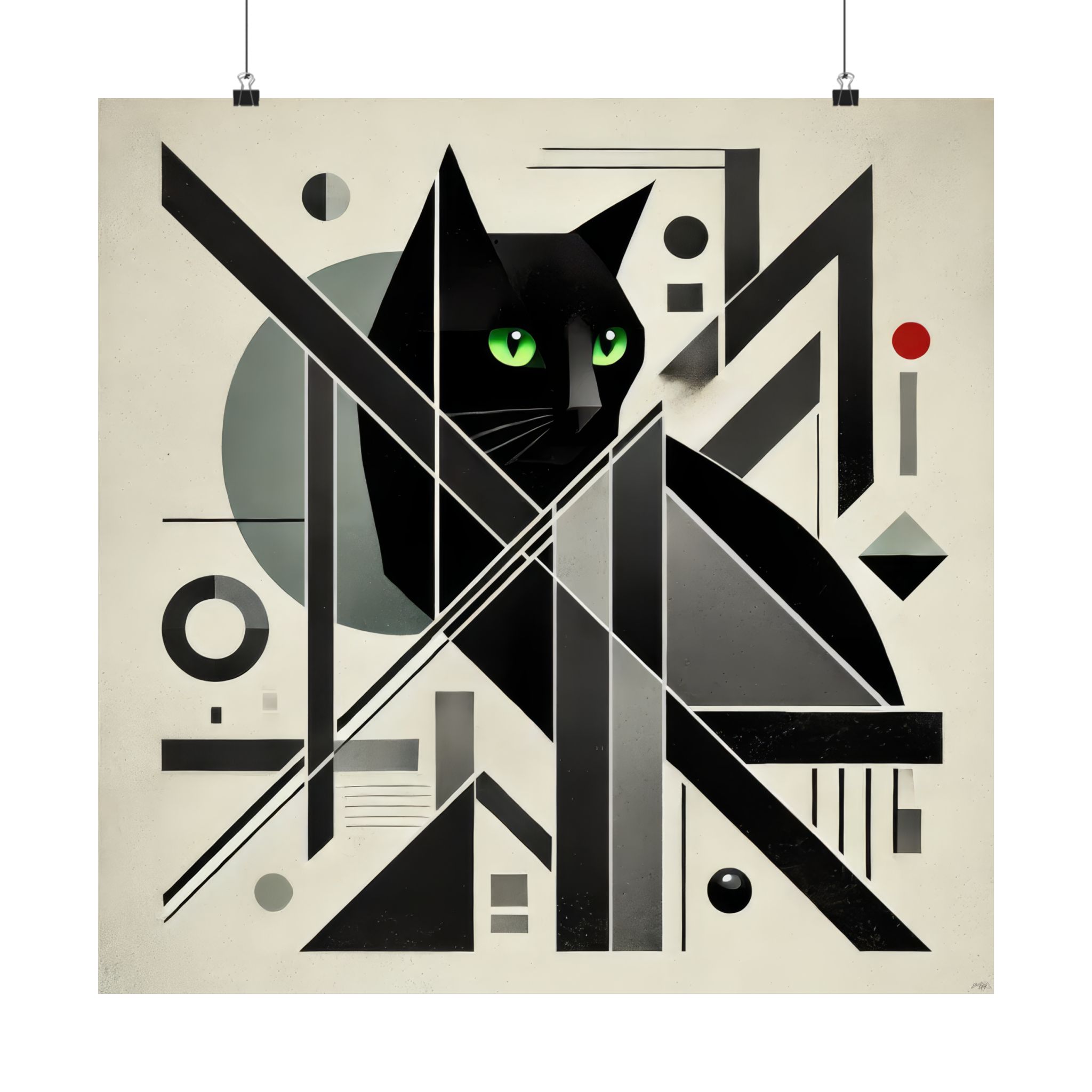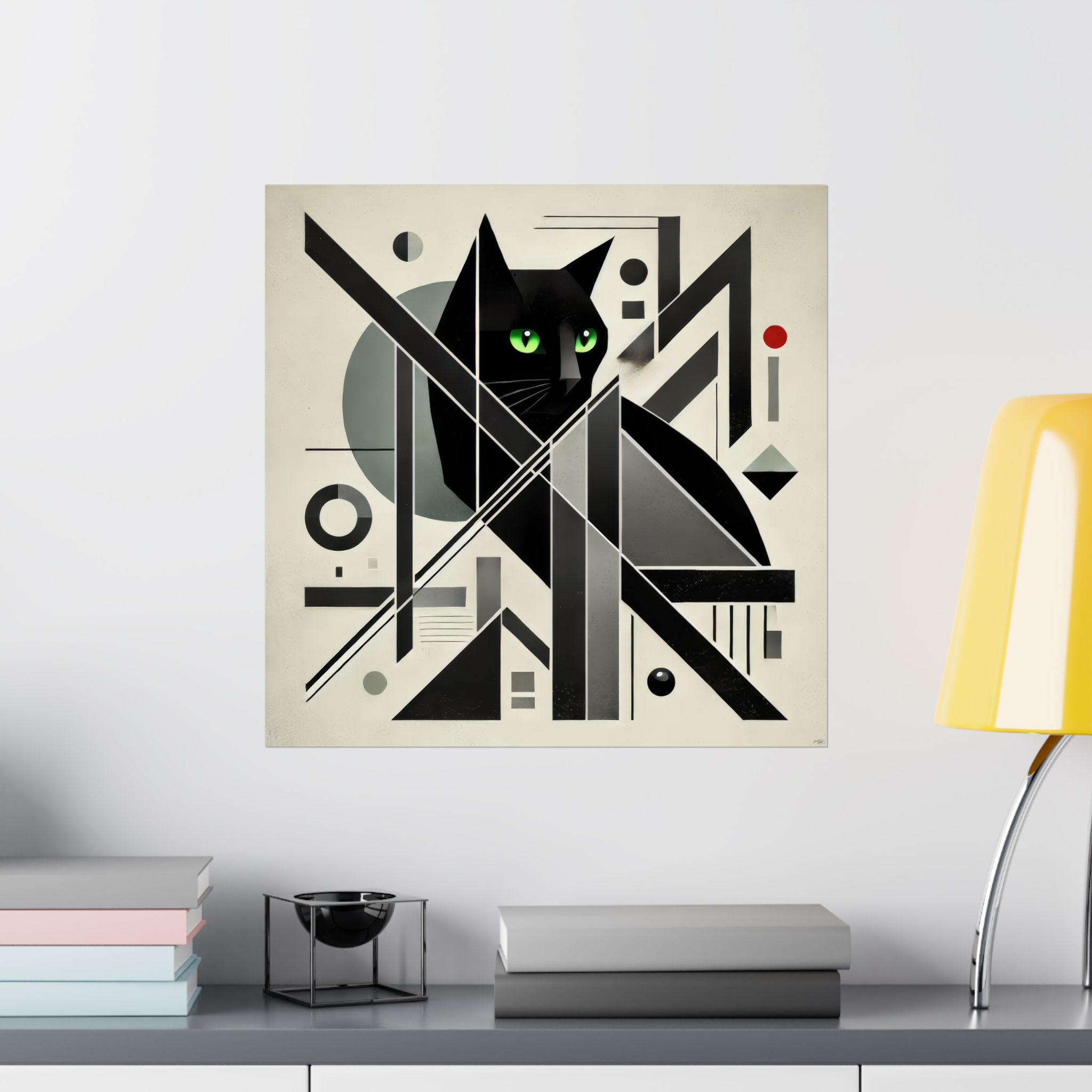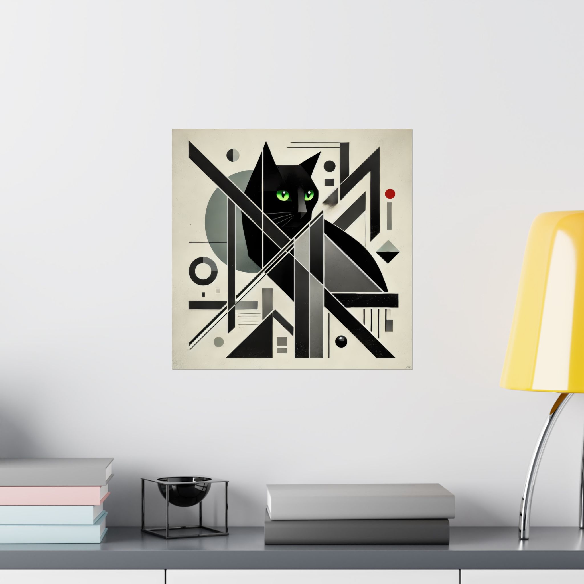 A striking matte poster that blends geometric abstraction with a watchful black cat at its center. The archival museum-grade paper and giclée printing keep the deep blacks and vivid green eyes rich and steady, while the light-absorbing matte finish removes glare to let the composition breathe on the wall. Available in many sizes for gallery walls or cozy nooks, this poster brings a quiet, modern mystery to indoor spaces — a piece that reads like a study in form and feline presence, inviting slow looks and repeated discovery.