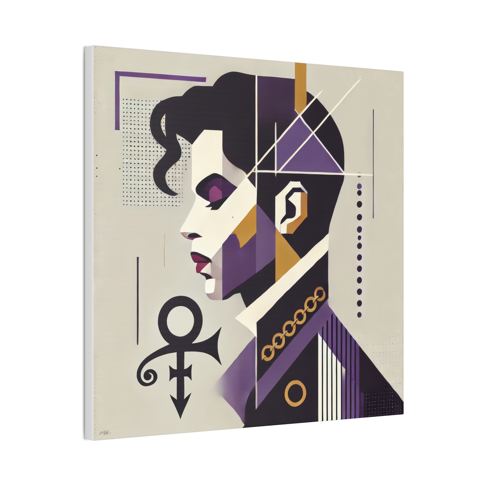 A bold stretched canvas that brings geometric portraiture and rich violet tones into any room. Printed on heavy-weight polyester and mounted to a sturdy pinewood frame, this piece sits just off the wall with a clean, gallery-ready presence. The stylized profile and symbolic motif create a mood of quiet intensity — a modern heirloom that anchors bedroom nooks, studio walls, or living rooms with curated taste. As you step closer the crisp printing and layered shapes reveal tiny details: halftone dots, sharp lines, and subtle texture where the image meets the canvas edge. Comes ready to hang with included hardware and a small QR code on the back for provenance or care info.