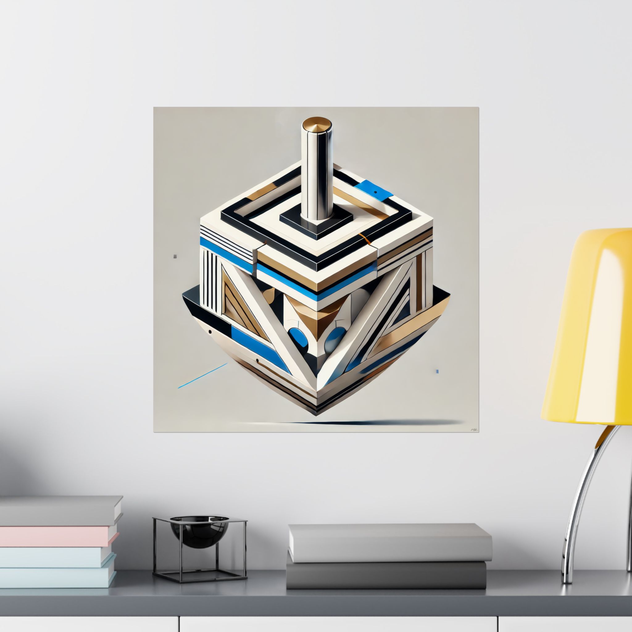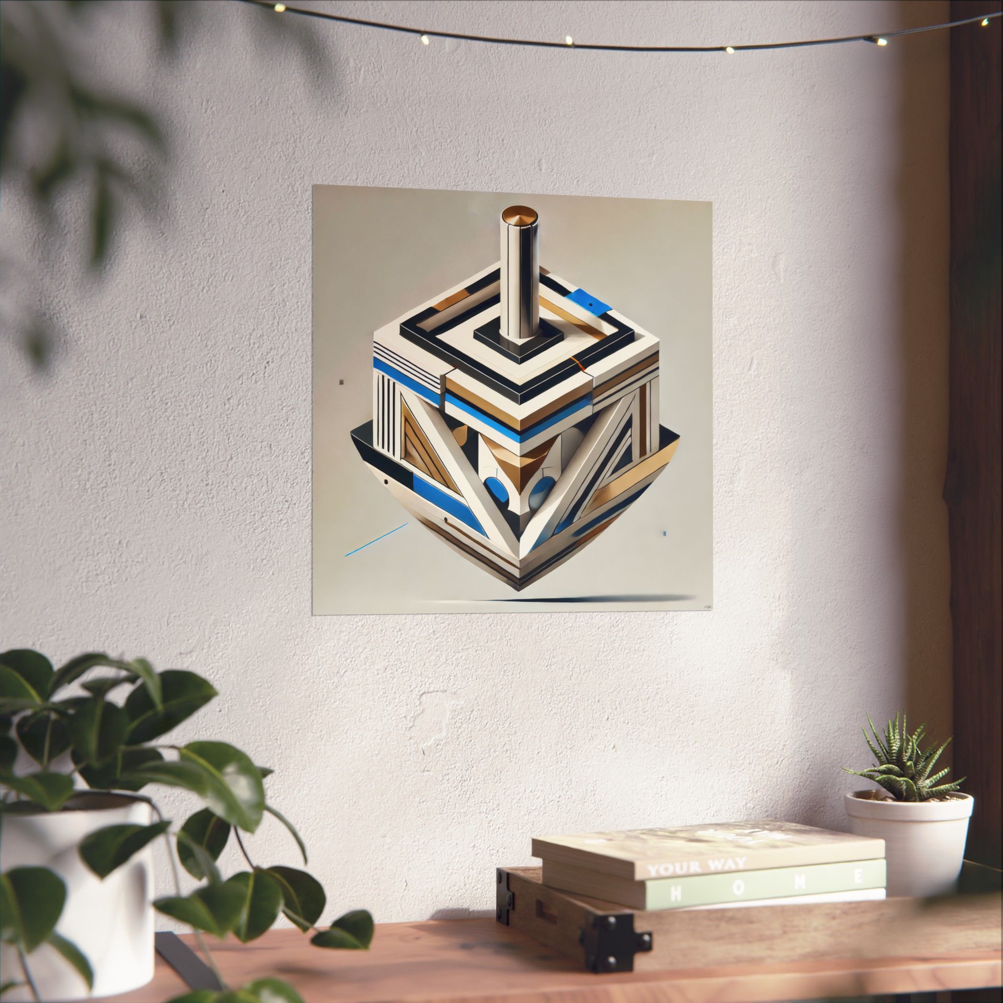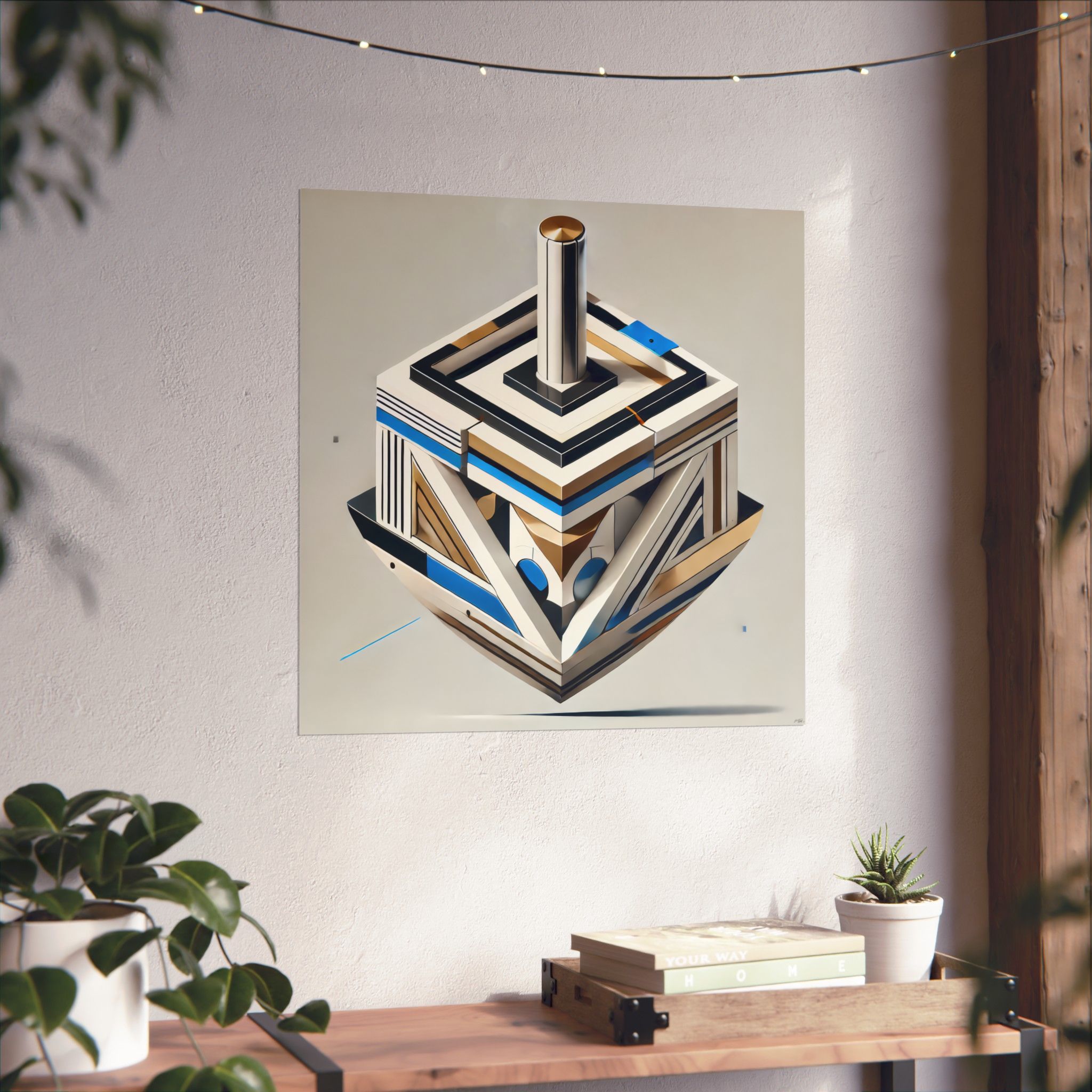 Clean, architectural lines meet soft, museum-grade paper in this matte vertical poster. The composition centers on a geometric cube—layered planes, precise angles and a single metallic column—that feels both engineered and poetic. Cool blues, warm neutrals and high-contrast blacks hold crisp, giclée-saturated color that resists fading. Hung in a studio, office, or modern living room, this print brings a quiet, contemplative energy: focus, craft, and balance without shouting. The matte finish absorbs glare and deepens tones, so the artwork reads beautifully from every angle.
