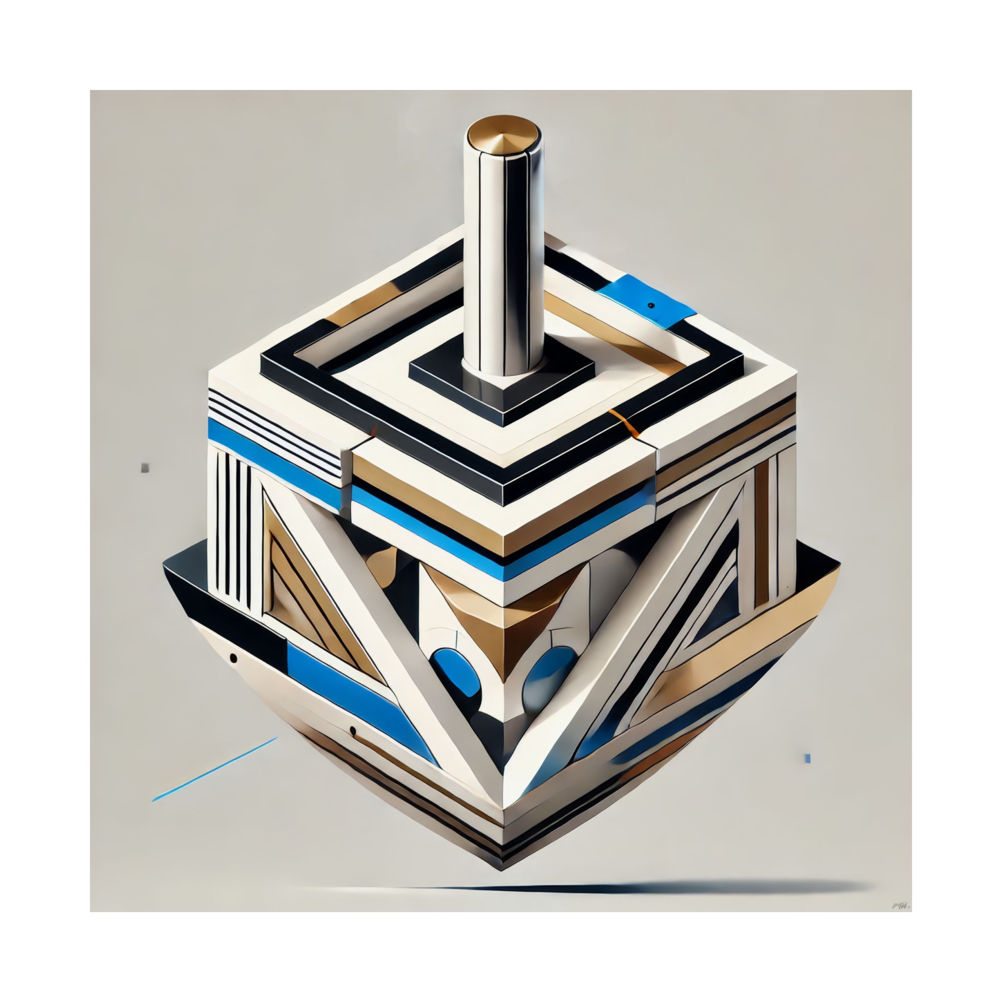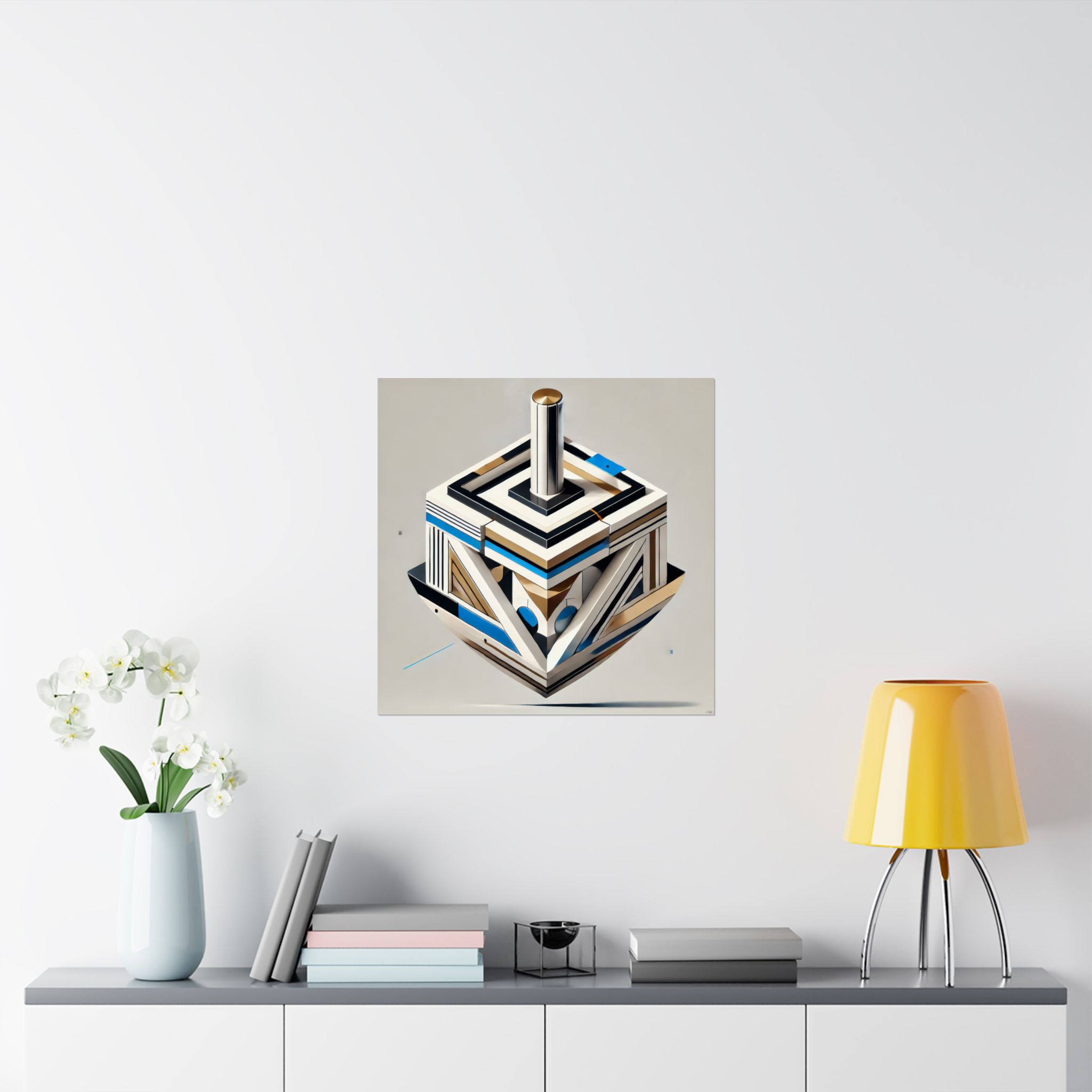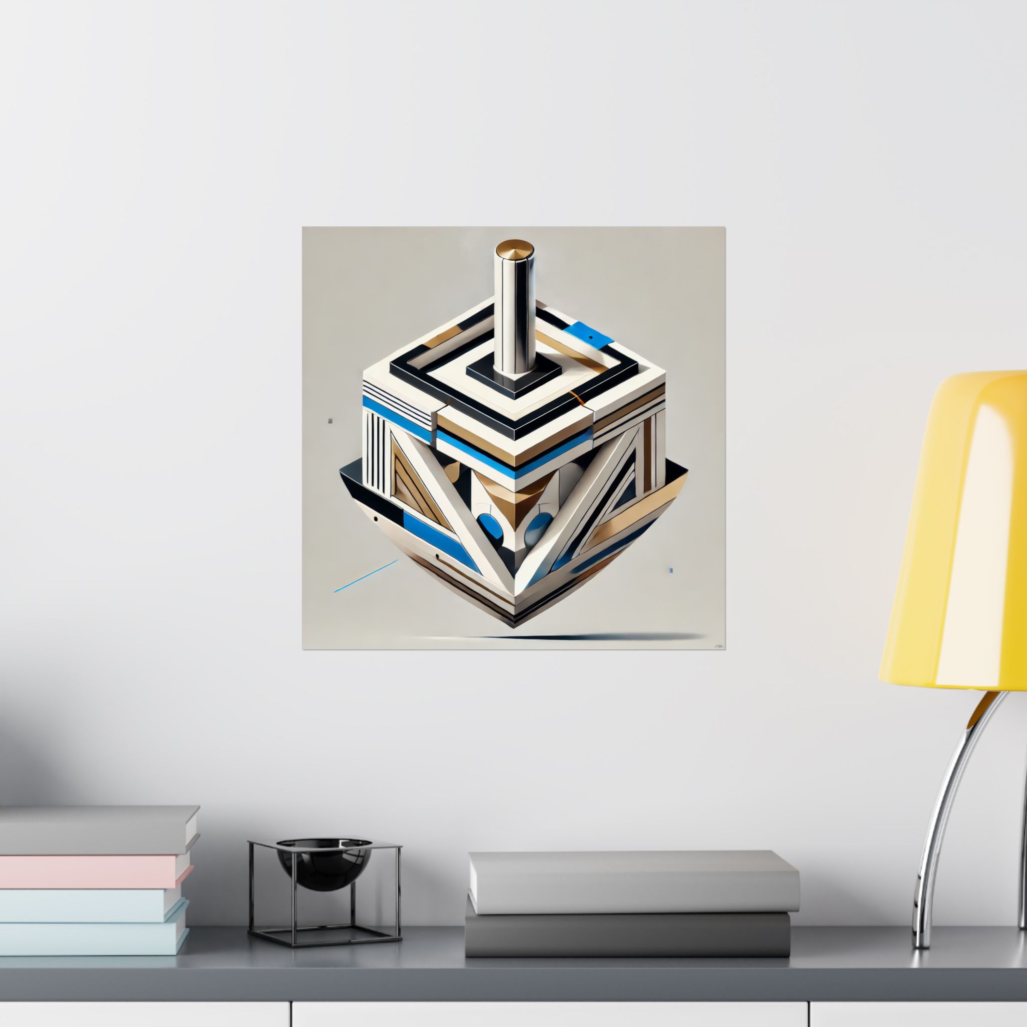Clean, architectural lines meet soft, museum-grade paper in this matte vertical poster. The composition centers on a geometric cube—layered planes, precise angles and a single metallic column—that feels both engineered and poetic. Cool blues, warm neutrals and high-contrast blacks hold crisp, giclée-saturated color that resists fading. Hung in a studio, office, or modern living room, this print brings a quiet, contemplative energy: focus, craft, and balance without shouting. The matte finish absorbs glare and deepens tones, so the artwork reads beautifully from every angle.