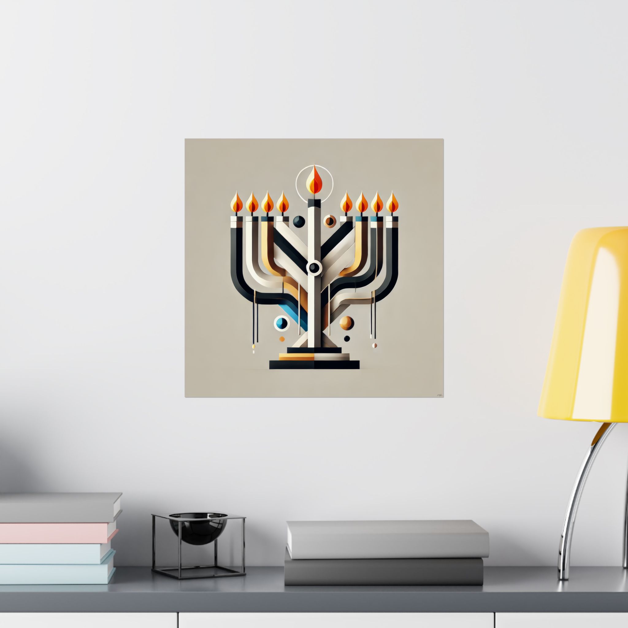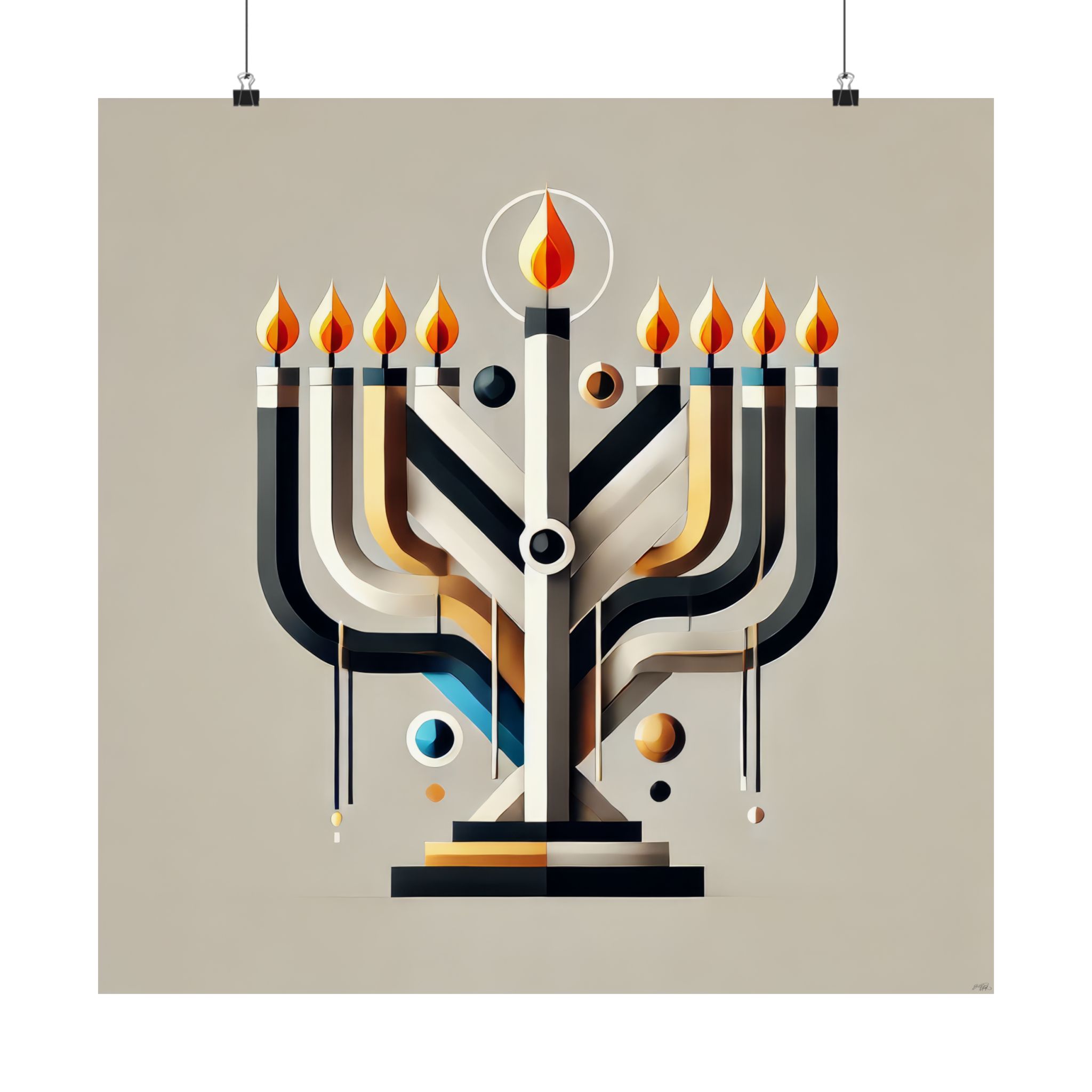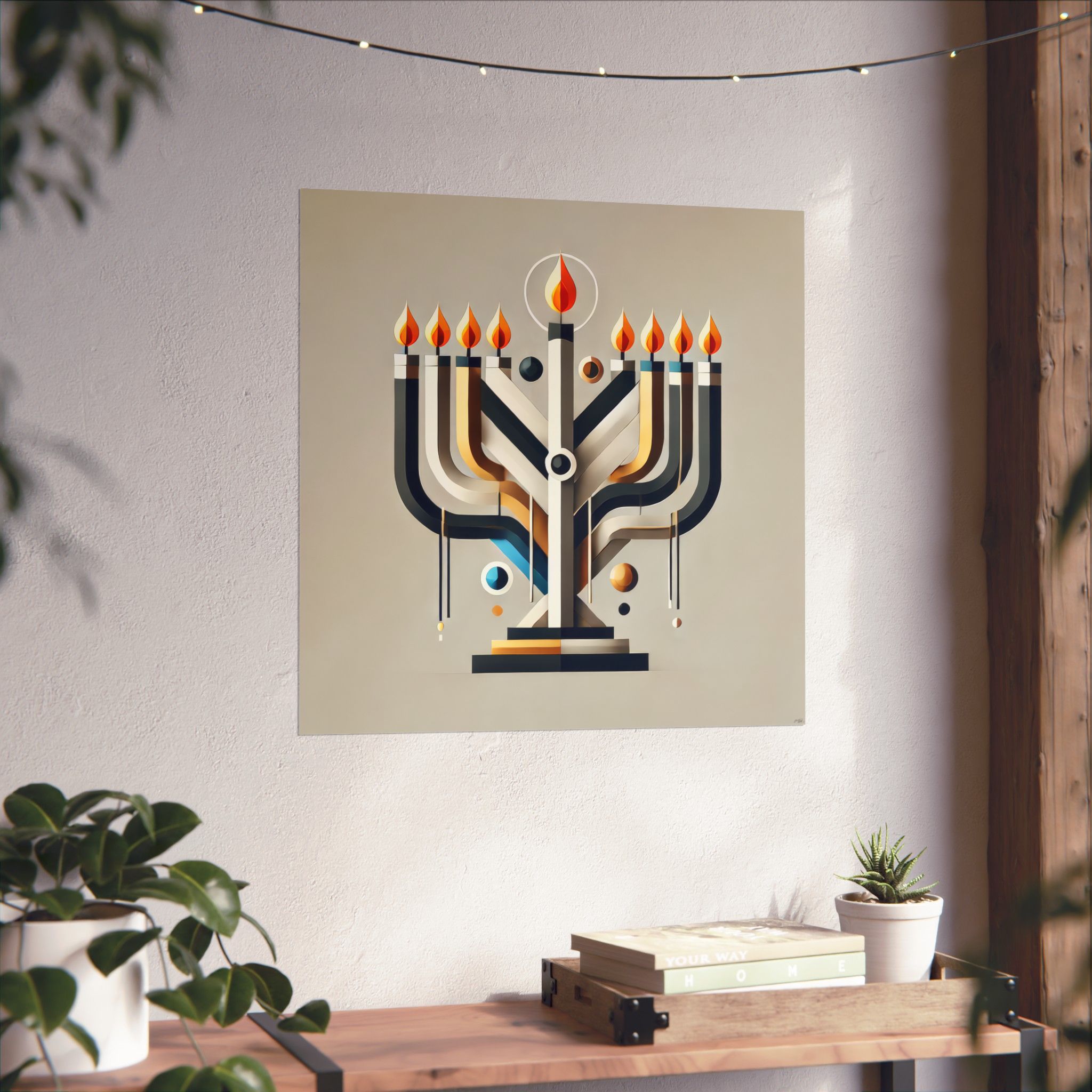 This matte poster captures a modern, graphic take on a menorah — clean lines, layered shapes, and warm candlelight rendered in vivid giclée color on archival museum-grade paper. The muted beige background lets the geometric forms and bright flames stand out without glare thanks to a soft matte finish. Hang it in a living room alcove, dining area, or entryway to add quiet warmth and contemporary flair during Hanukkah or year-round as a piece of thoughtful, everyday art. Sizes and weights available make it easy to choose a scale that fits your wall and framing style; printed with longevity in mind so the tones stay true over time.