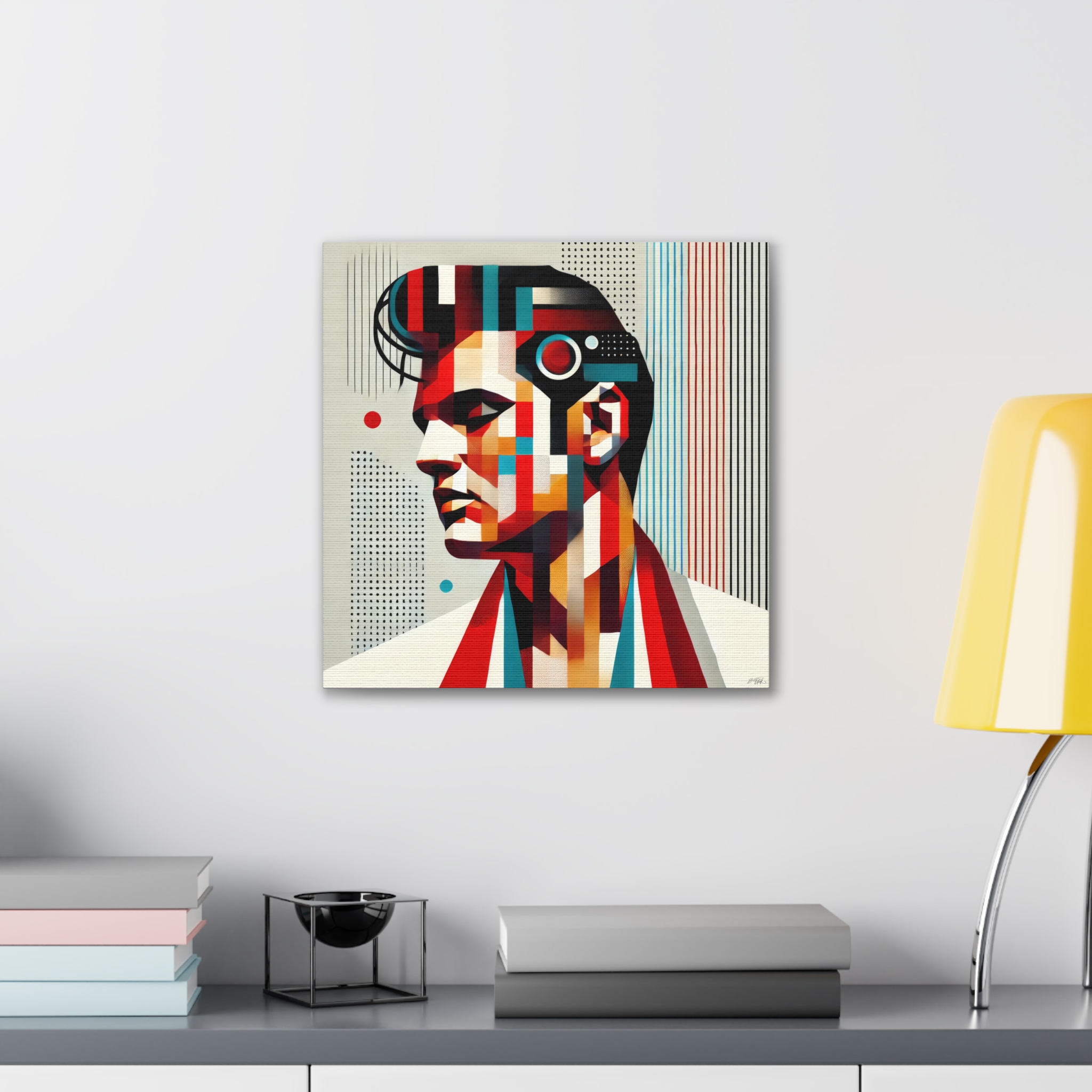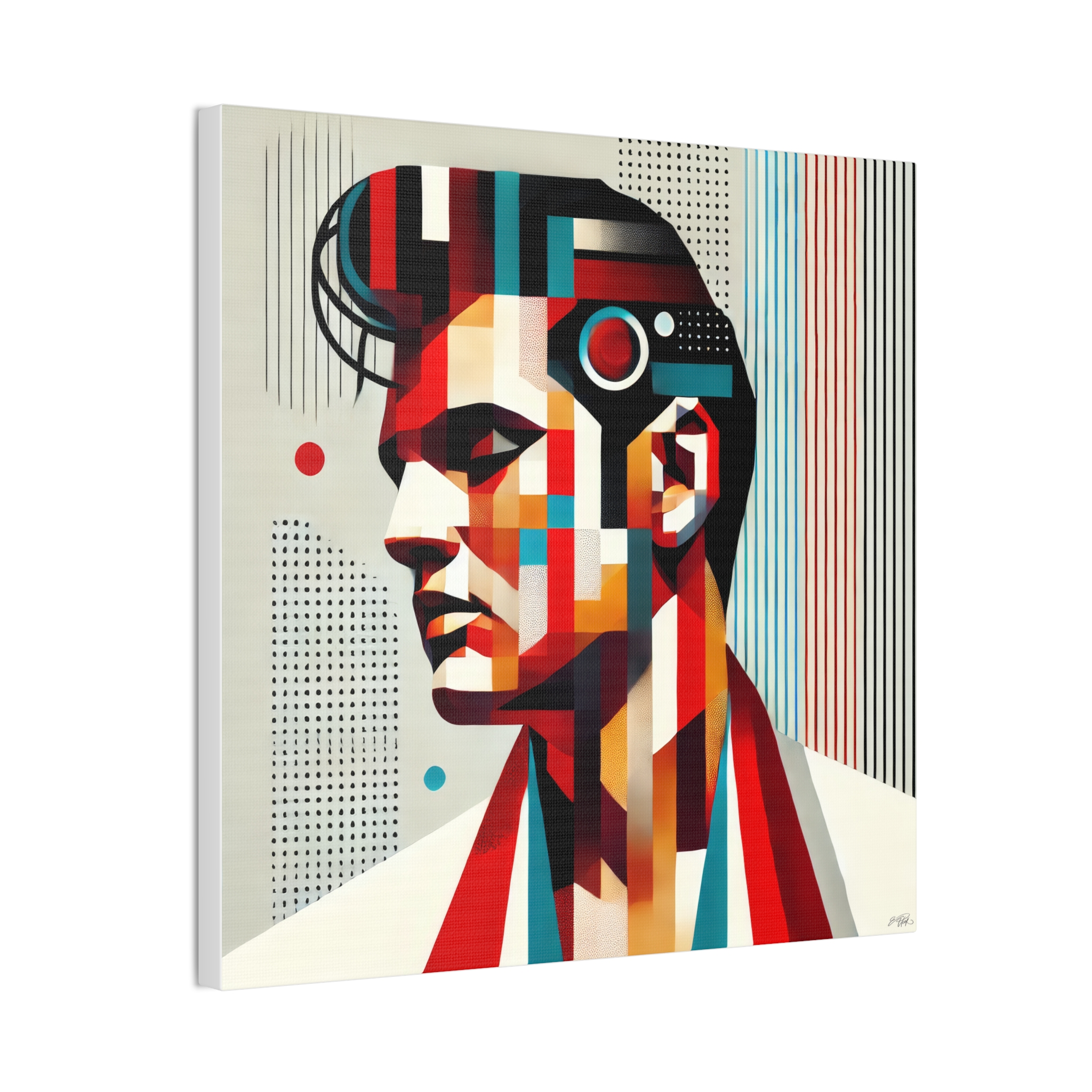 A bold stretched canvas that brings geometric portraiture and rich violet tones into any room. Printed on heavy-weight polyester and mounted to a sturdy pinewood frame, this piece sits just off the wall with a clean, gallery-ready presence. The stylized profile and symbolic motif create a mood of quiet intensity — a modern heirloom that anchors bedroom nooks, studio walls, or living rooms with curated taste. As you step closer the crisp printing and layered shapes reveal tiny details: halftone dots, sharp lines, and subtle texture where the image meets the canvas edge. Comes ready to hang with included hardware and a small QR code on the back for provenance or care info.