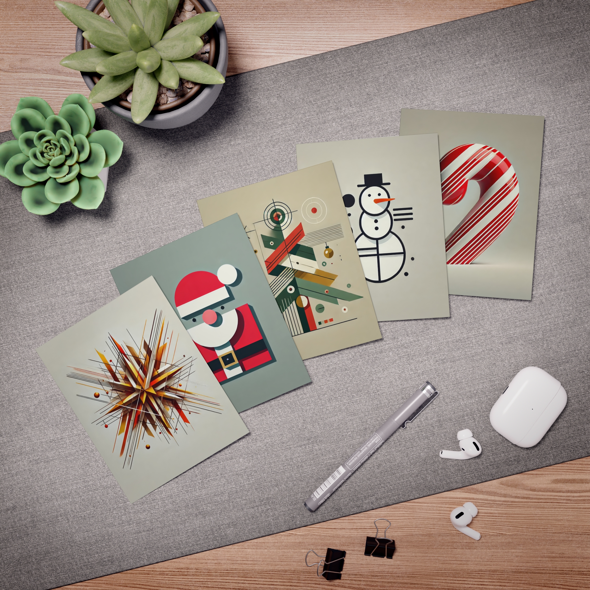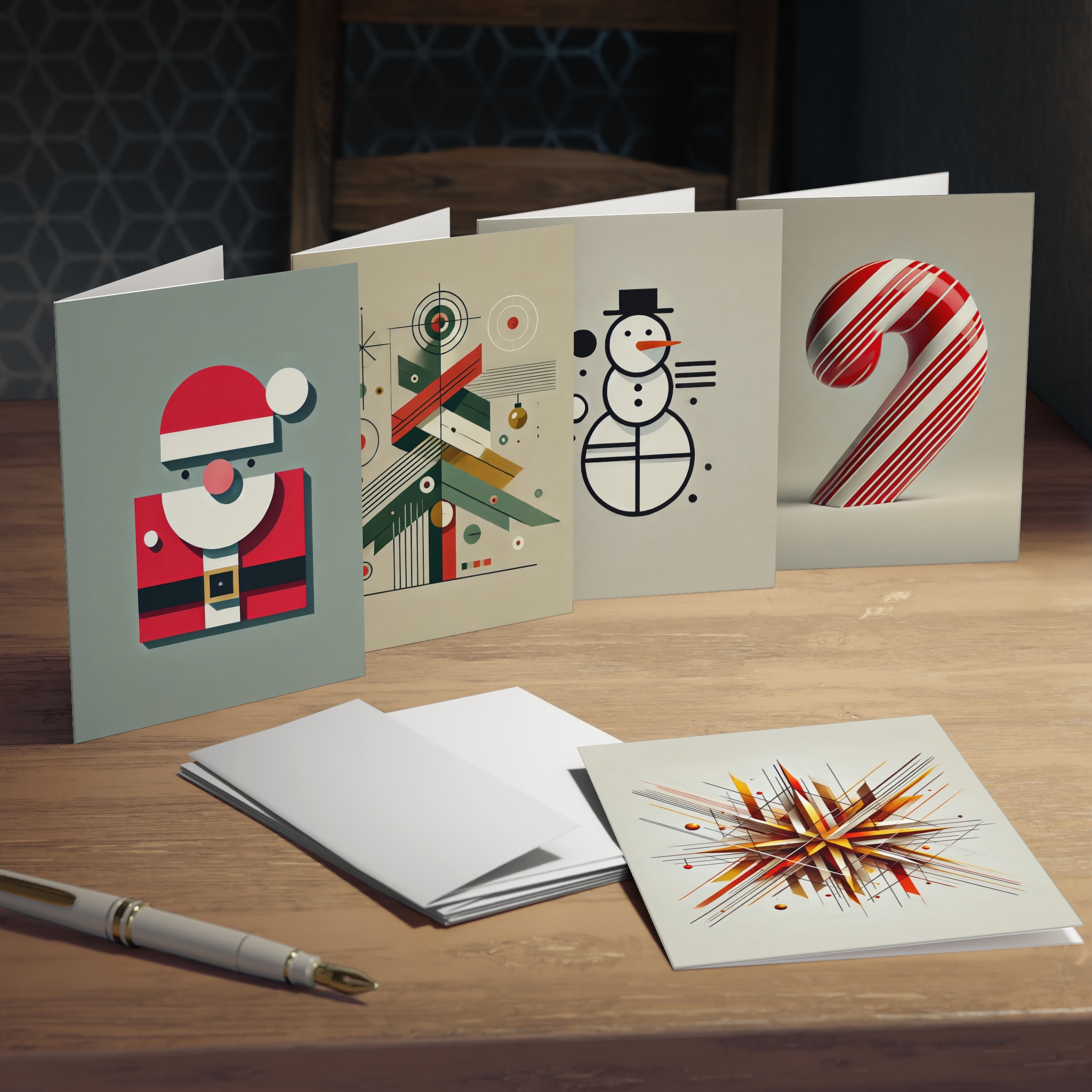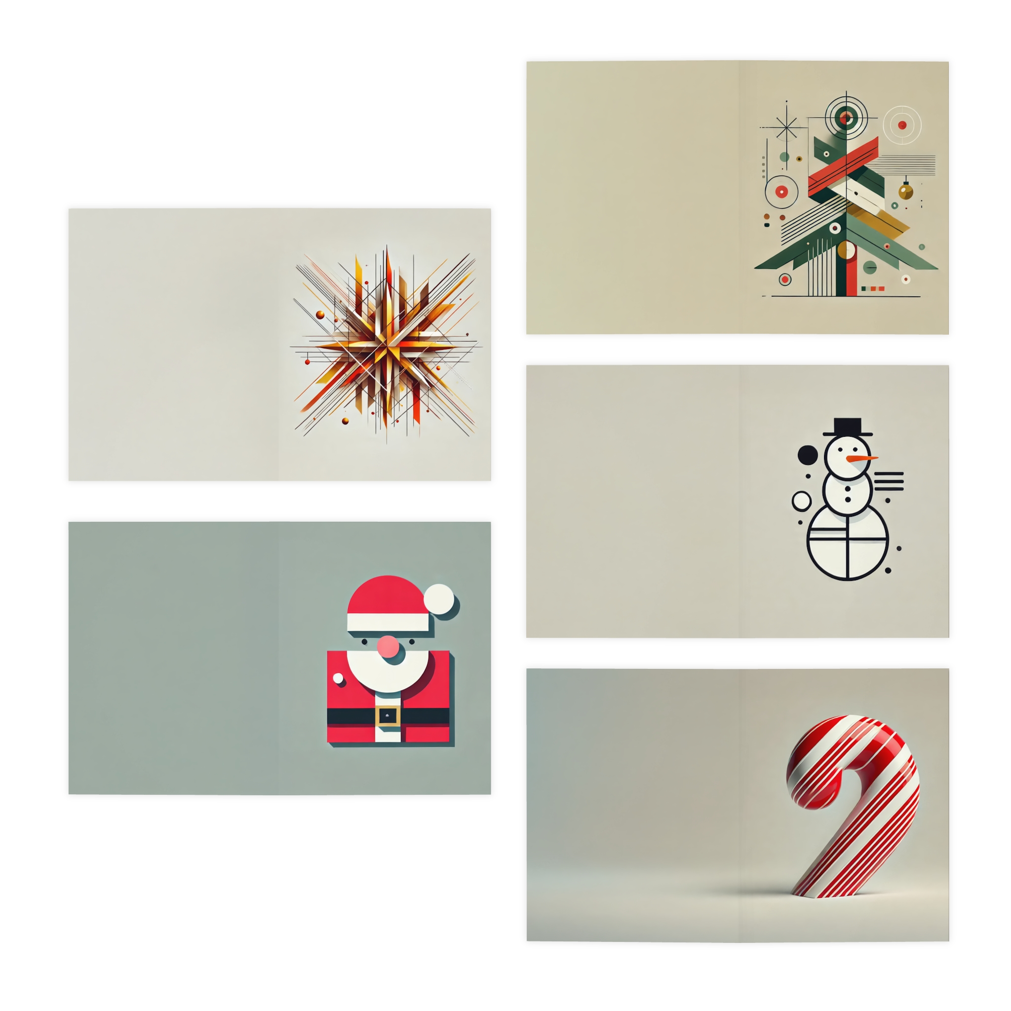 A set of five artful greeting cards that bring vintage-modern holiday cheer to the mailbox. Each card features a unique, minimalist illustration — geometric Christmas tree, stylized Santa, playful snowman, starburst abstract — printed in vivid color on thick 271gsm uncoated white stock. Cards measure 4.25″ x 5.5″ and arrive with matching white envelopes, ready to write a personal message inside or leave blank for your own touch. The subtly overlapping front cover and back create a polished, professional look. Assembled in the USA from globally sourced parts, these cards feel both handcrafted and gallery-ready — great for sending warmth, nostalgia, and thoughtful design this season.
