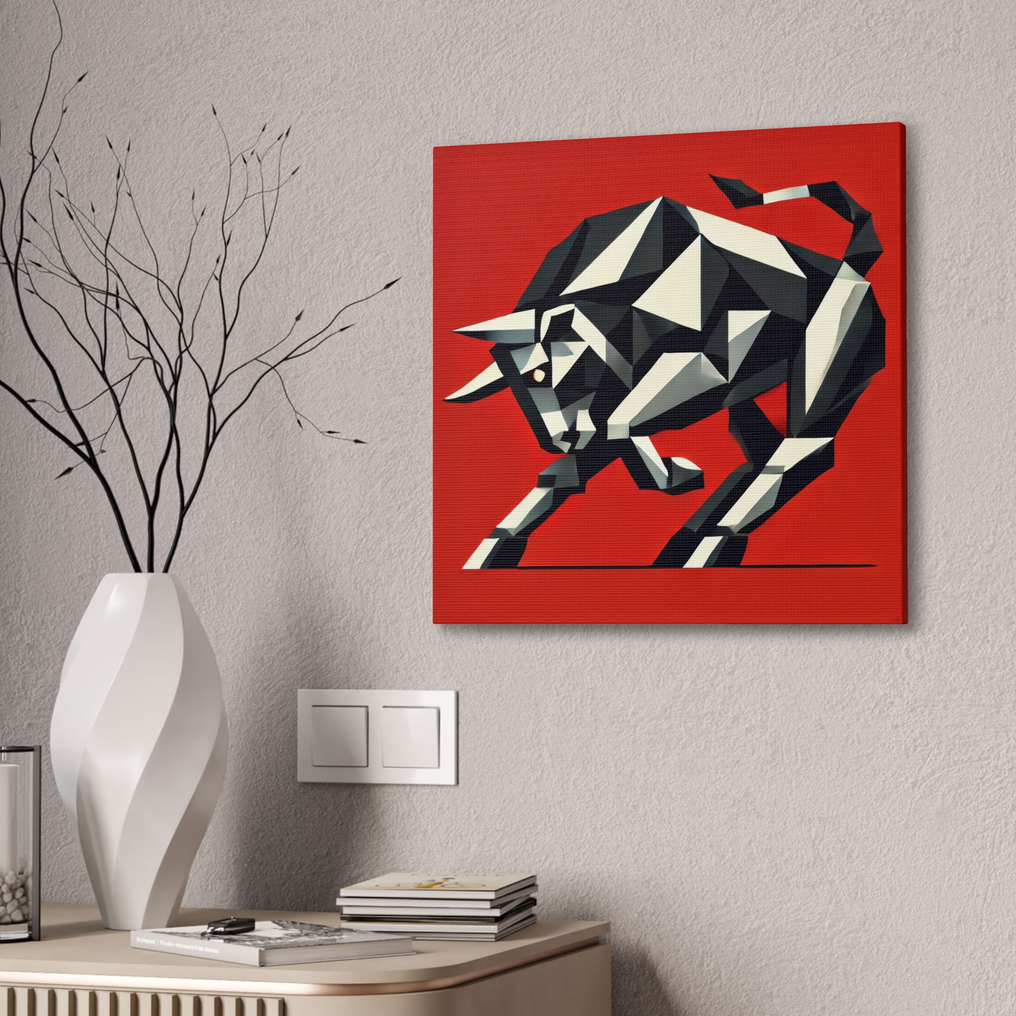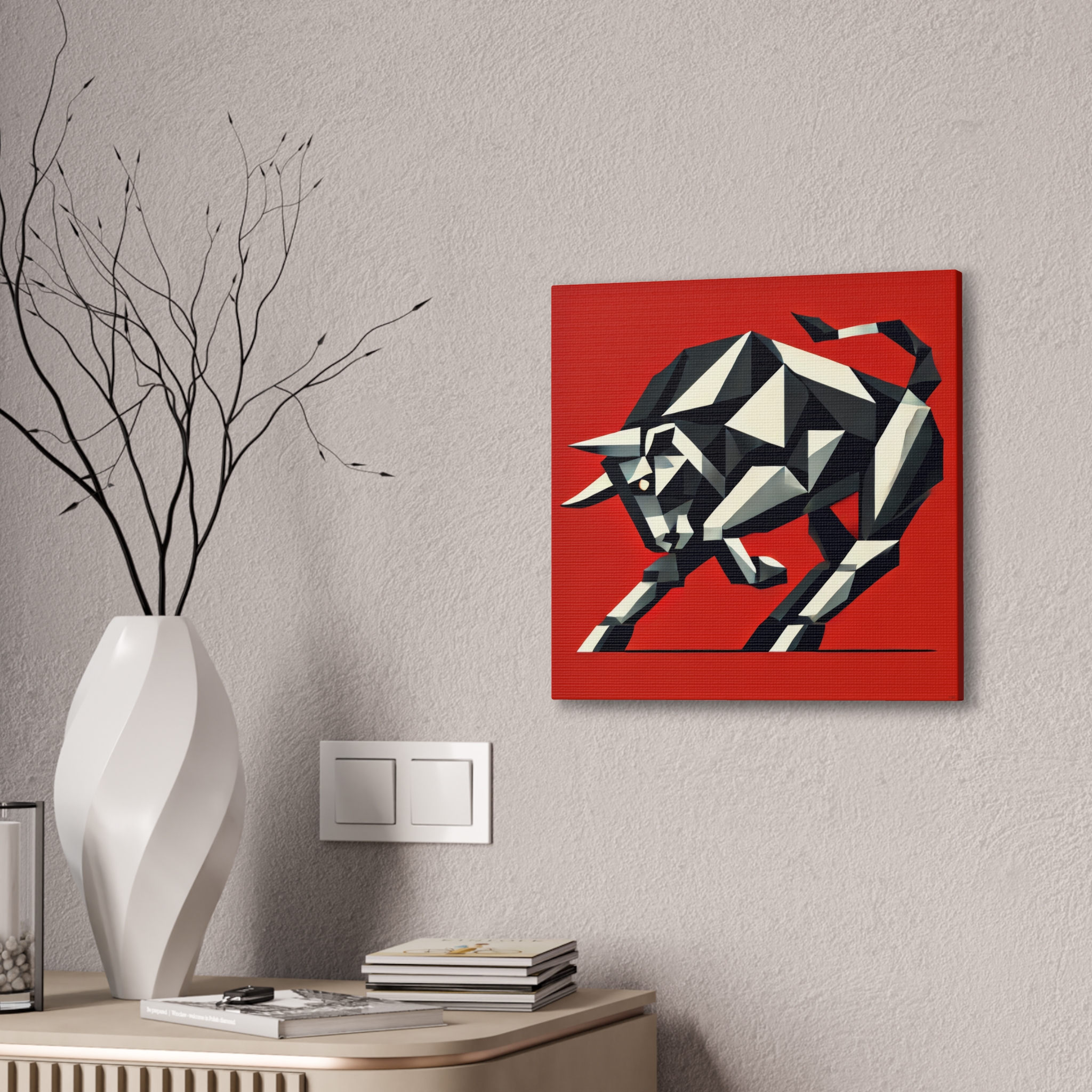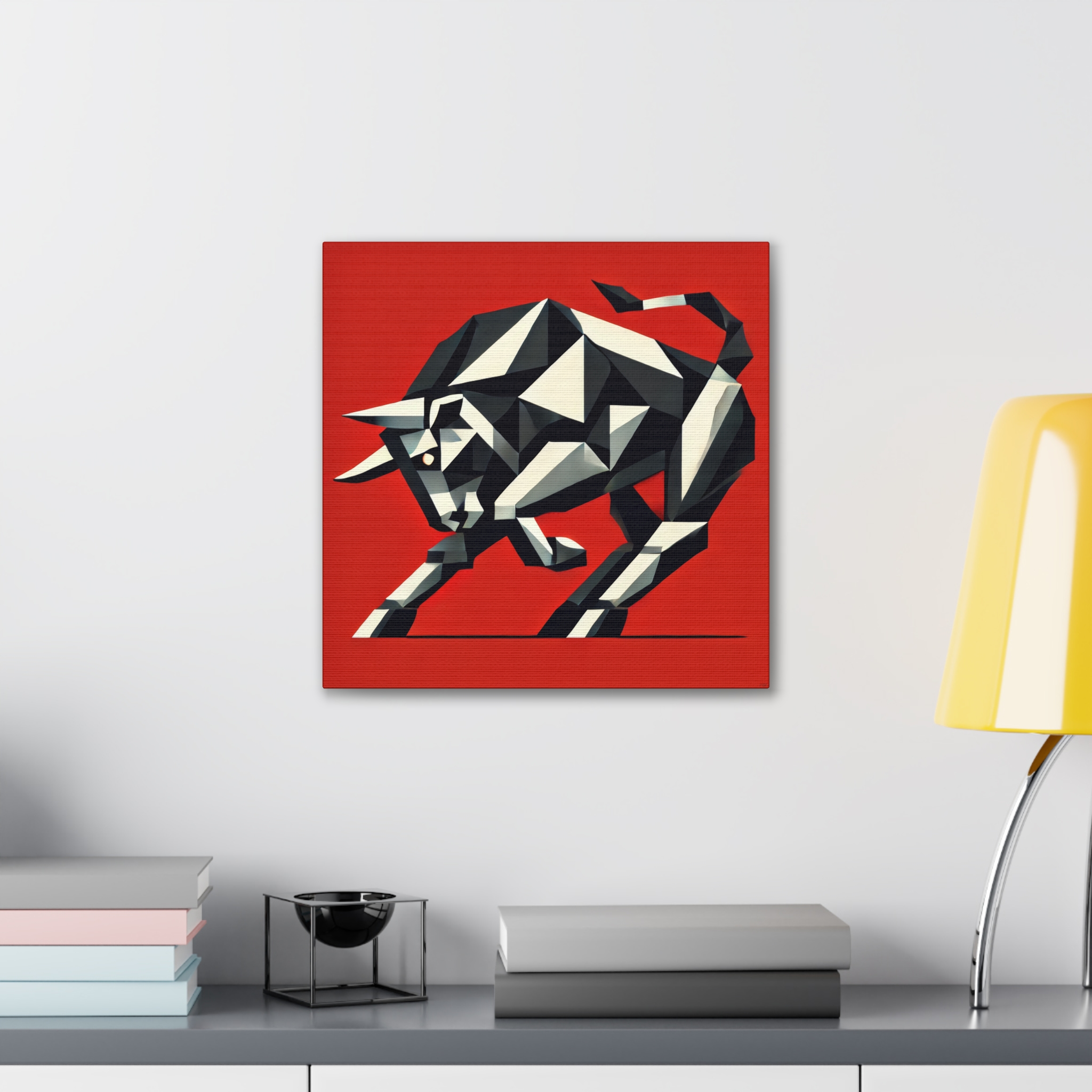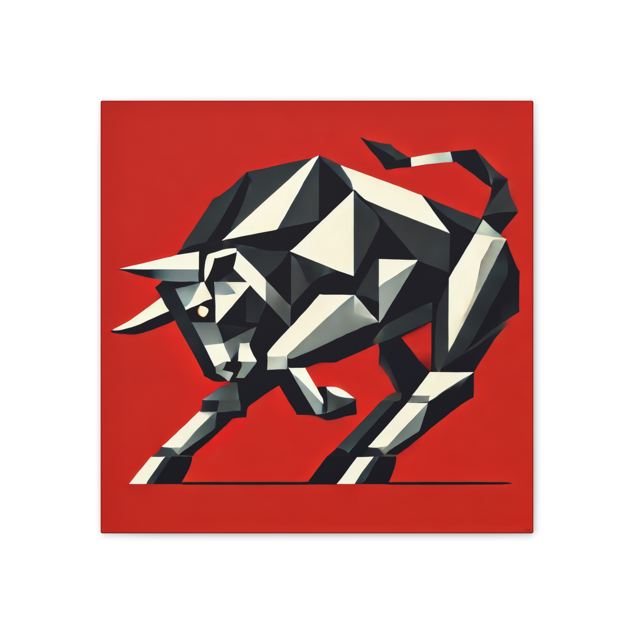 A bold stretched canvas designed to suit a wide range of interiors. Printed on heavy-weight polyester canvas and mounted to a sturdy pinewood frame, the piece sits just off the wall with a clean, gallery-ready presence. The balanced composition and modern visual language create a calm yet confident mood, making it well suited to bedrooms, studios, and living spaces. Up close, crisp printing and layered forms reveal fine details such as halftone texture, sharp linework, and subtle edge transitions where the image wraps around the canvas. Comes ready to hang with included hardware, with a small QR code on the back for care or provenance information.