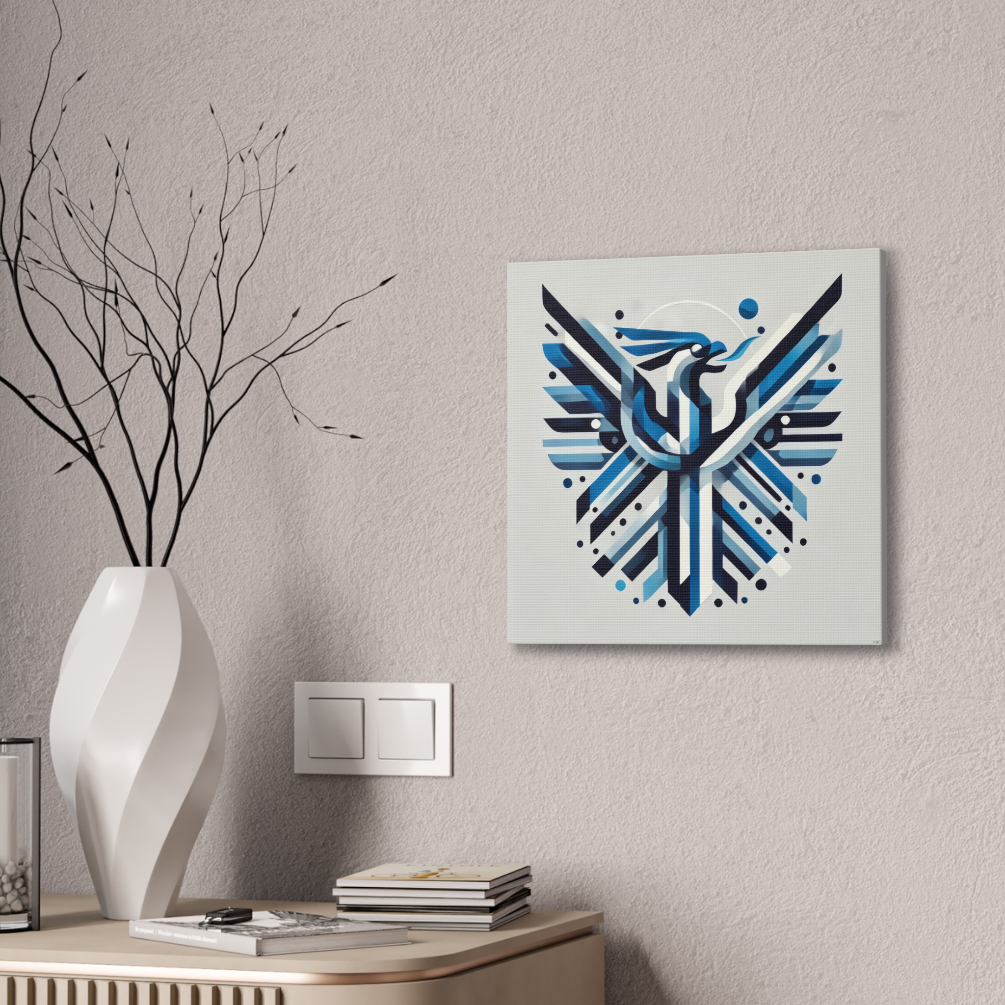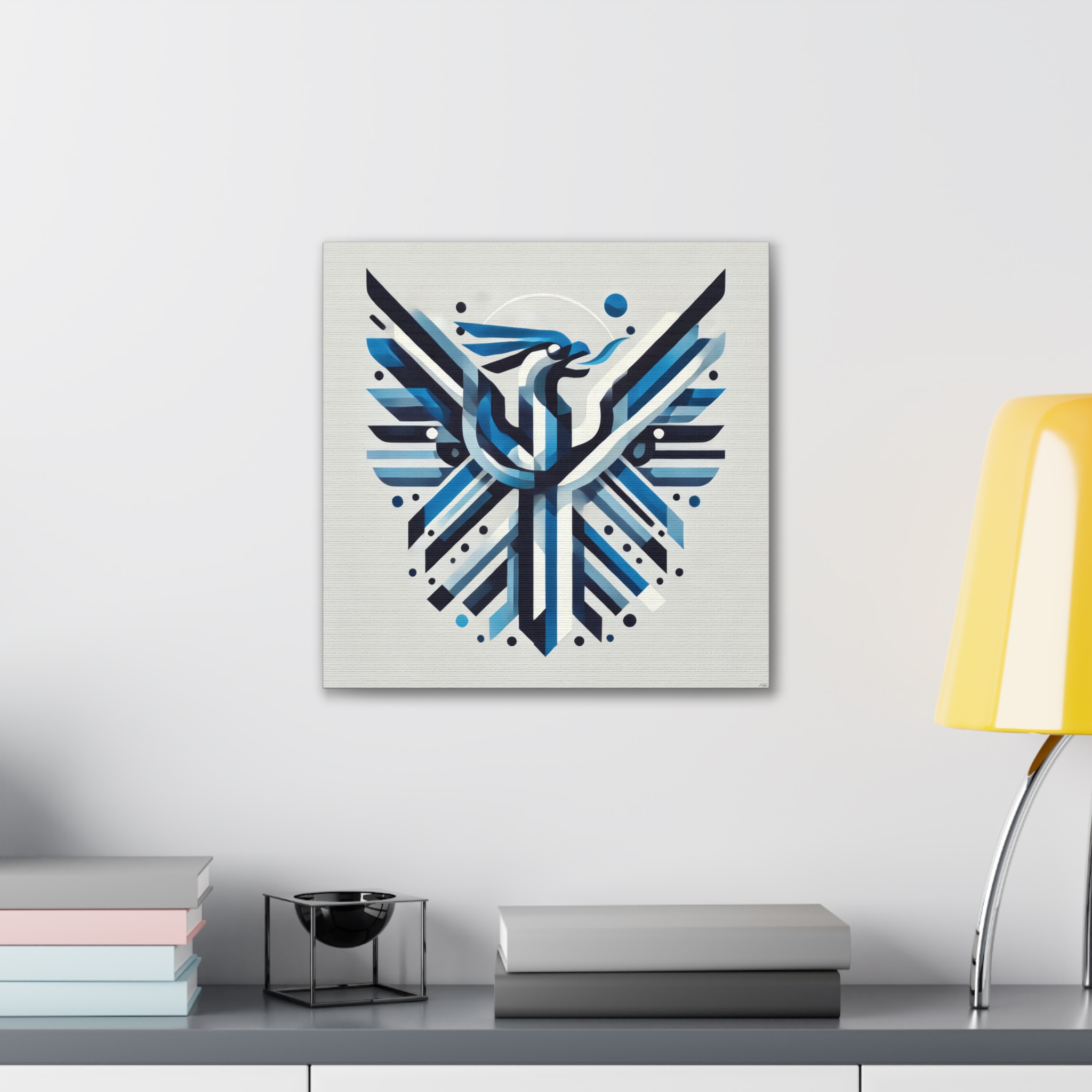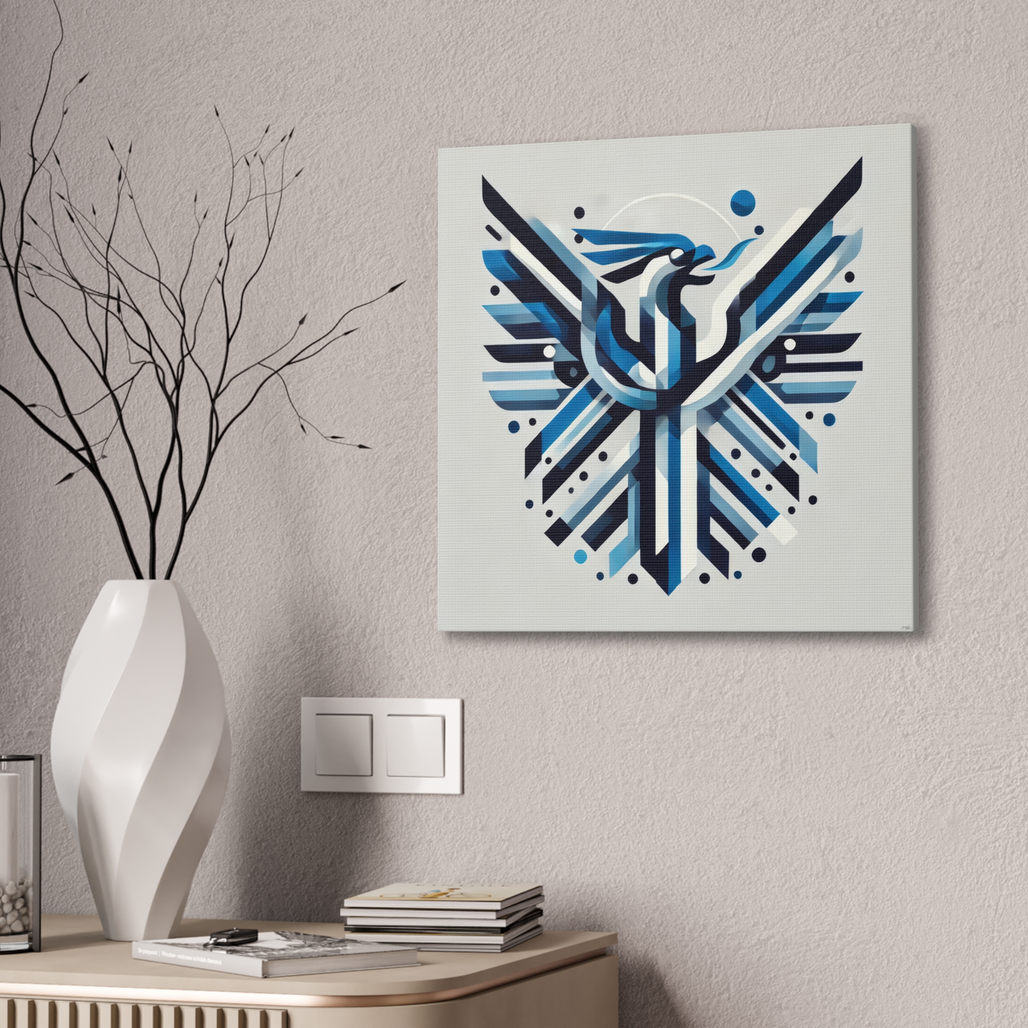 A bold stretched canvas designed to suit a wide range of interiors. Printed on heavy-weight polyester canvas and mounted to a sturdy pinewood frame, the piece sits just off the wall with a clean, gallery-ready presence. The balanced composition and modern visual language create a calm yet confident mood, making it well suited to bedrooms,…