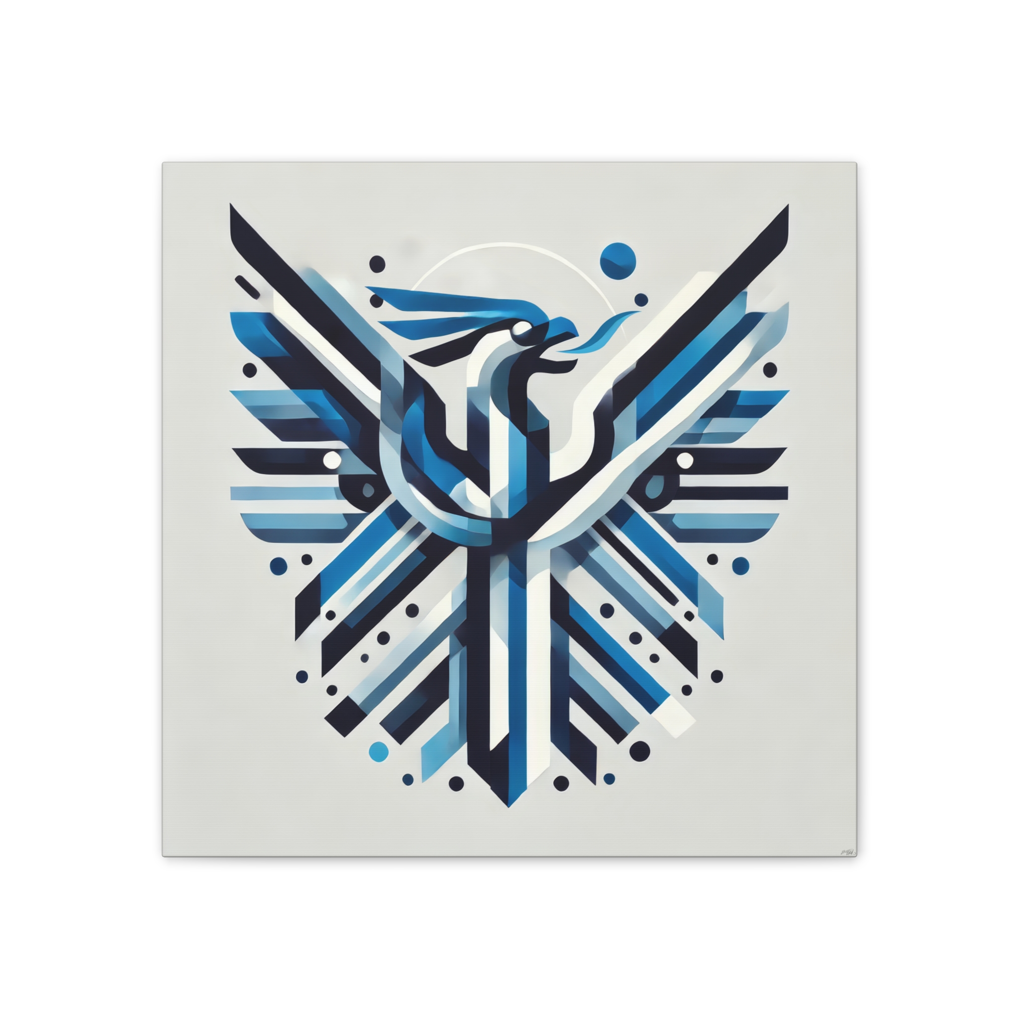 A bold stretched canvas designed to suit a wide range of interiors. Printed on heavy-weight polyester canvas and mounted to a sturdy pinewood frame, the piece sits just off the wall with a clean, gallery-ready presence. The balanced composition and modern visual language create a calm yet confident mood, making it well suited to bedrooms, studios, and living spaces. Up close, crisp printing and layered forms reveal fine details such as halftone texture, sharp linework, and subtle edge transitions where the image wraps around the canvas. Comes ready to hang with included hardware, with a small QR code on the back for care or provenance information.