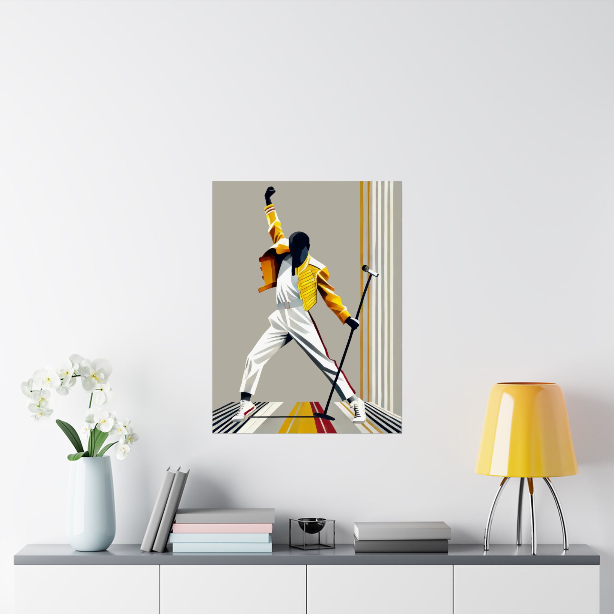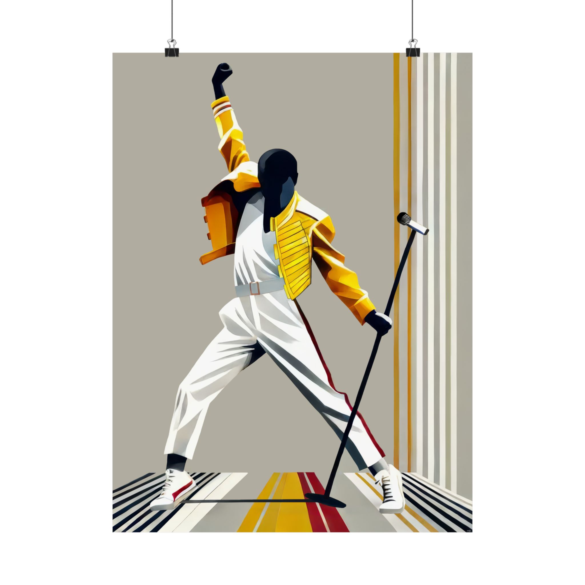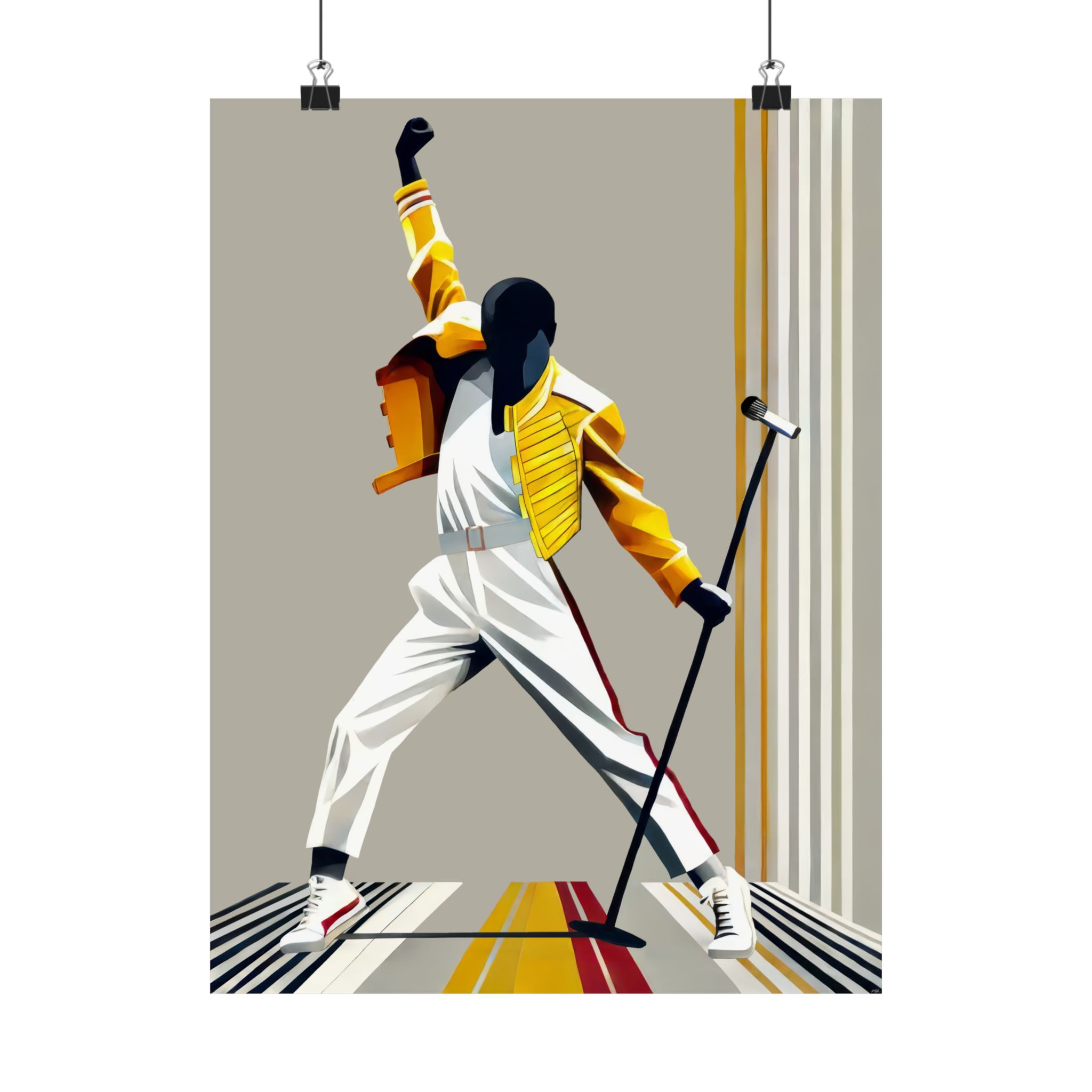 This matte vertical poster captures a bold, kinetic moment — a silhouetted performer frozen mid-gesture against clean, retro-inspired stripes. Printed with museum-grade archival paper and giclée inks, the image keeps its saturated yellows, warm neutrals, and deep shadows without glare thanks to the light-absorbing matte finish. Hang it in a music corner, studio wall, or living room to bring movement and vintage stage energy into the space. The strong lines and dynamic pose make it an expressive focal point that complements minimalist, mid-century, and pop-culture collections.