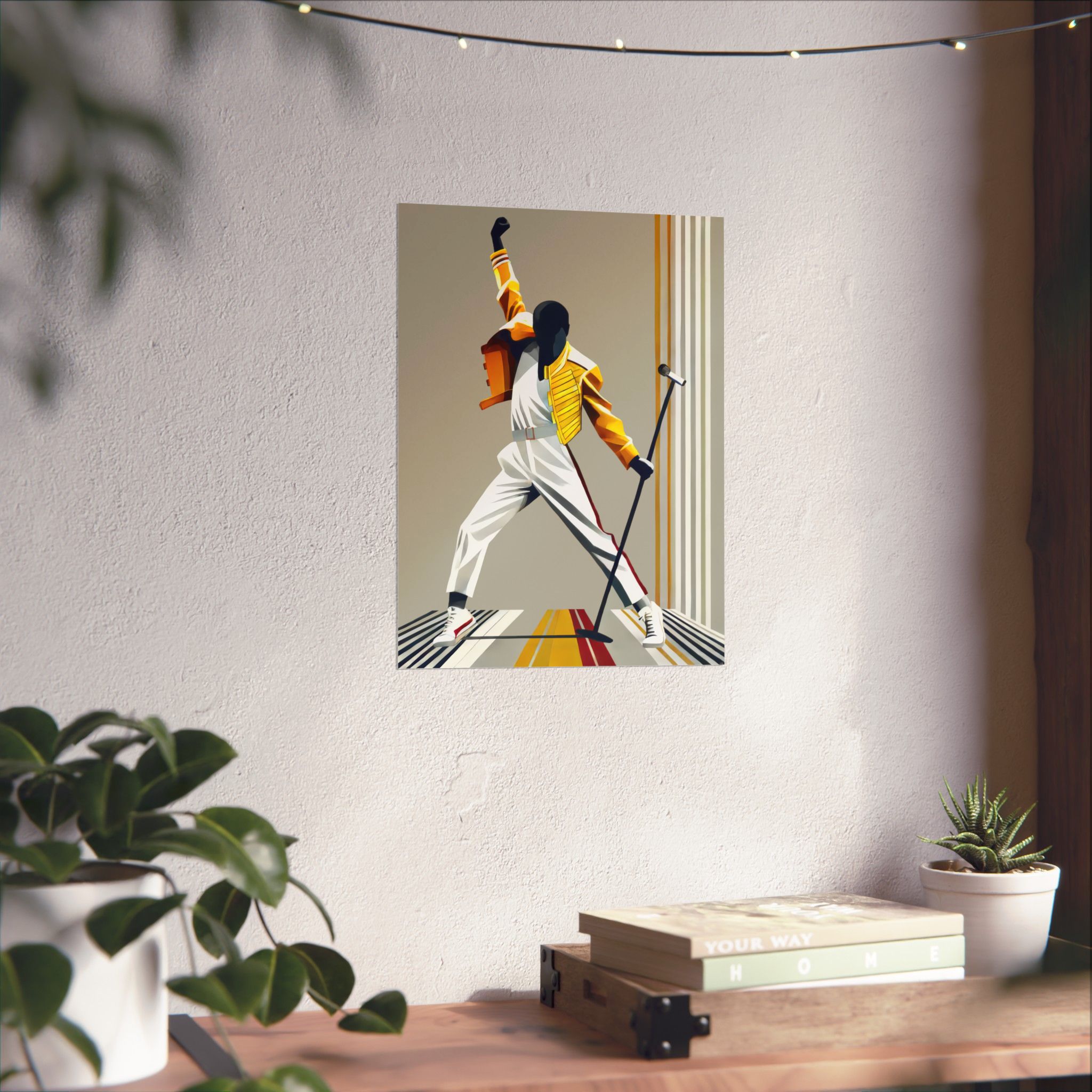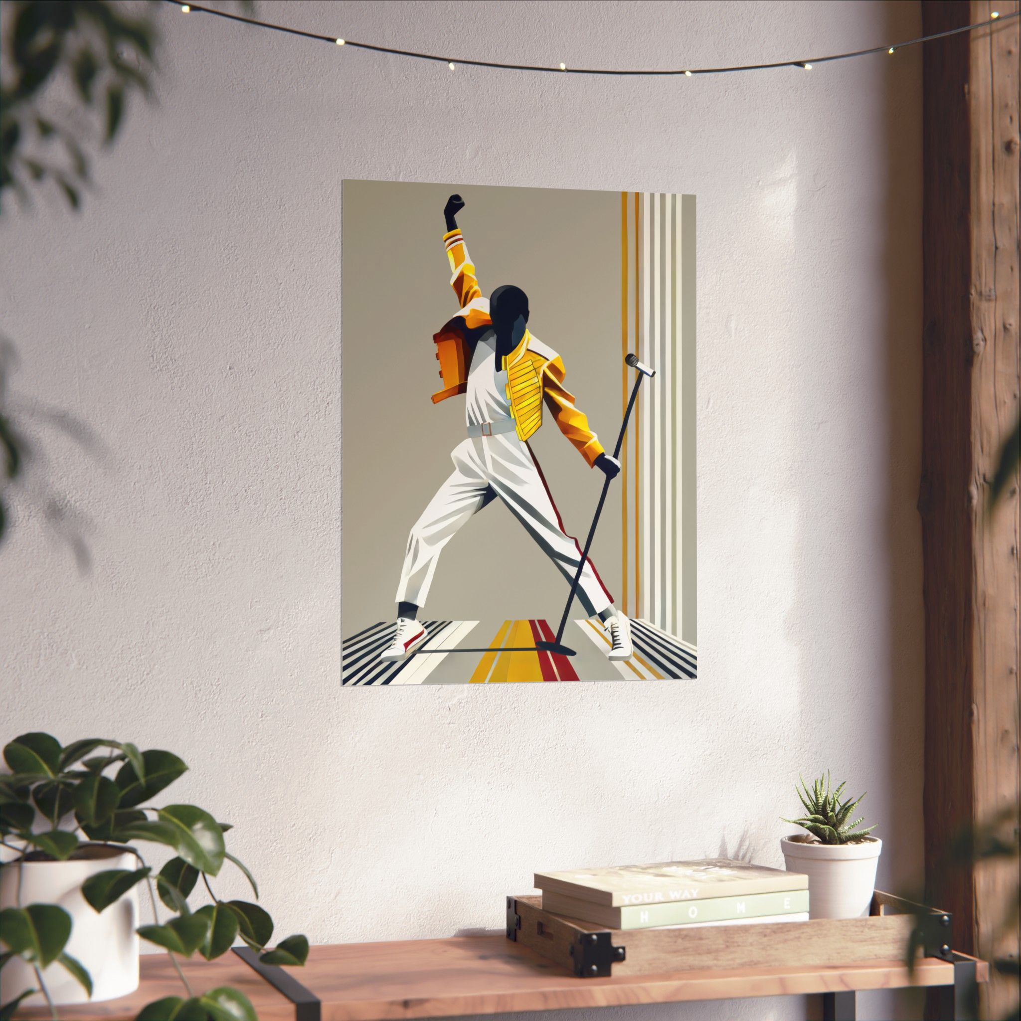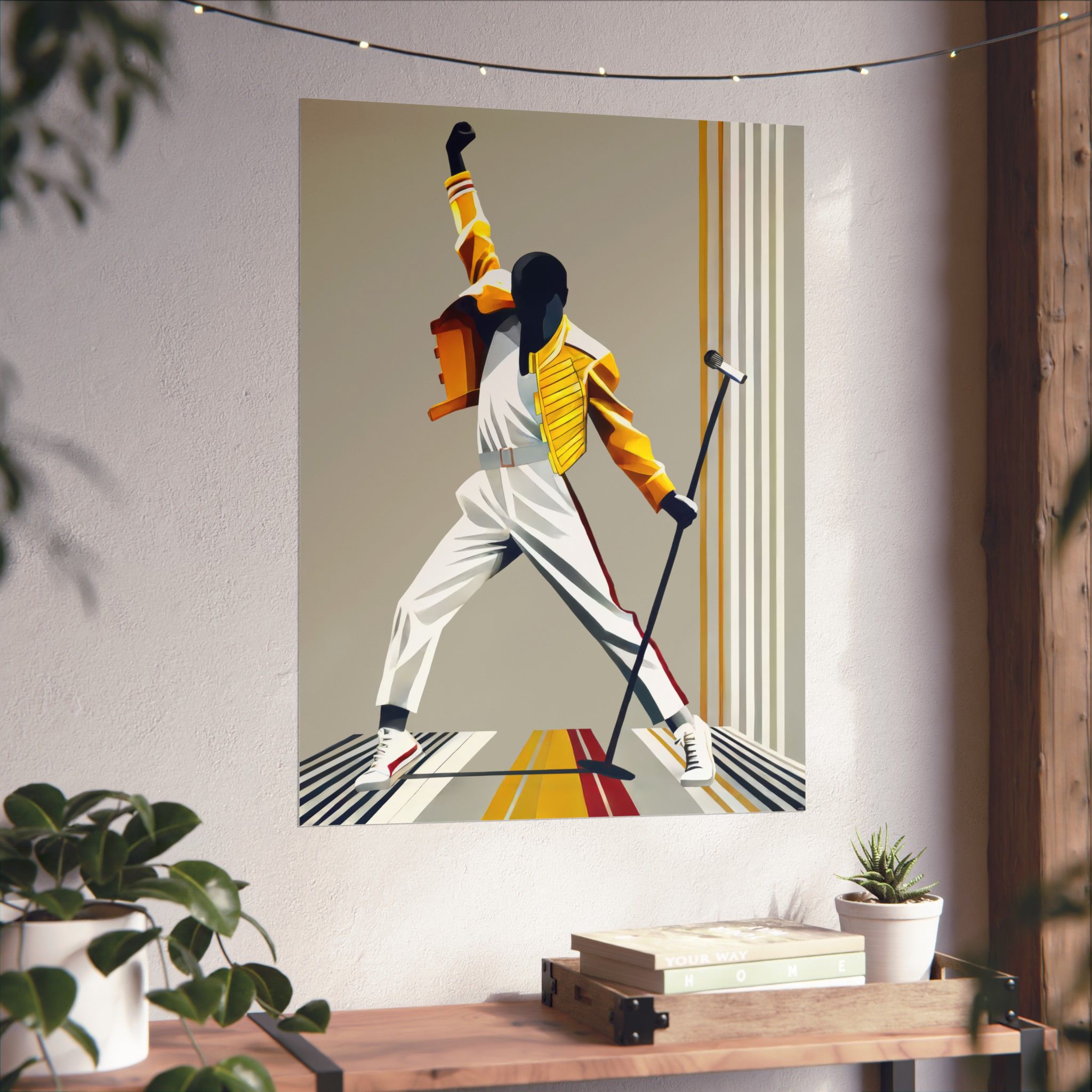 This matte vertical poster captures a bold, kinetic moment — a silhouetted performer frozen mid-gesture against clean, retro-inspired stripes. Printed with museum-grade archival paper and giclée inks, the image keeps its saturated yellows, warm neutrals, and deep shadows without glare thanks to the light-absorbing matte finish. Hang it in a music corner, studio wall, or living room to bring movement and vintage stage energy into the space. The strong lines and dynamic pose make it an expressive focal point that complements minimalist, mid-century, and pop-culture collections.