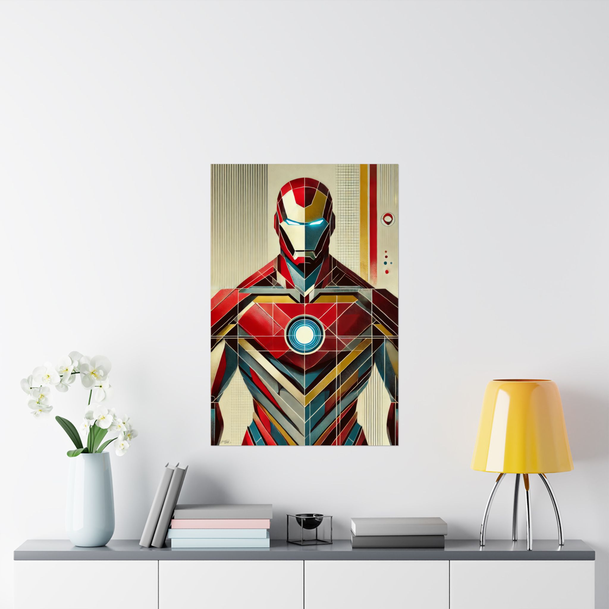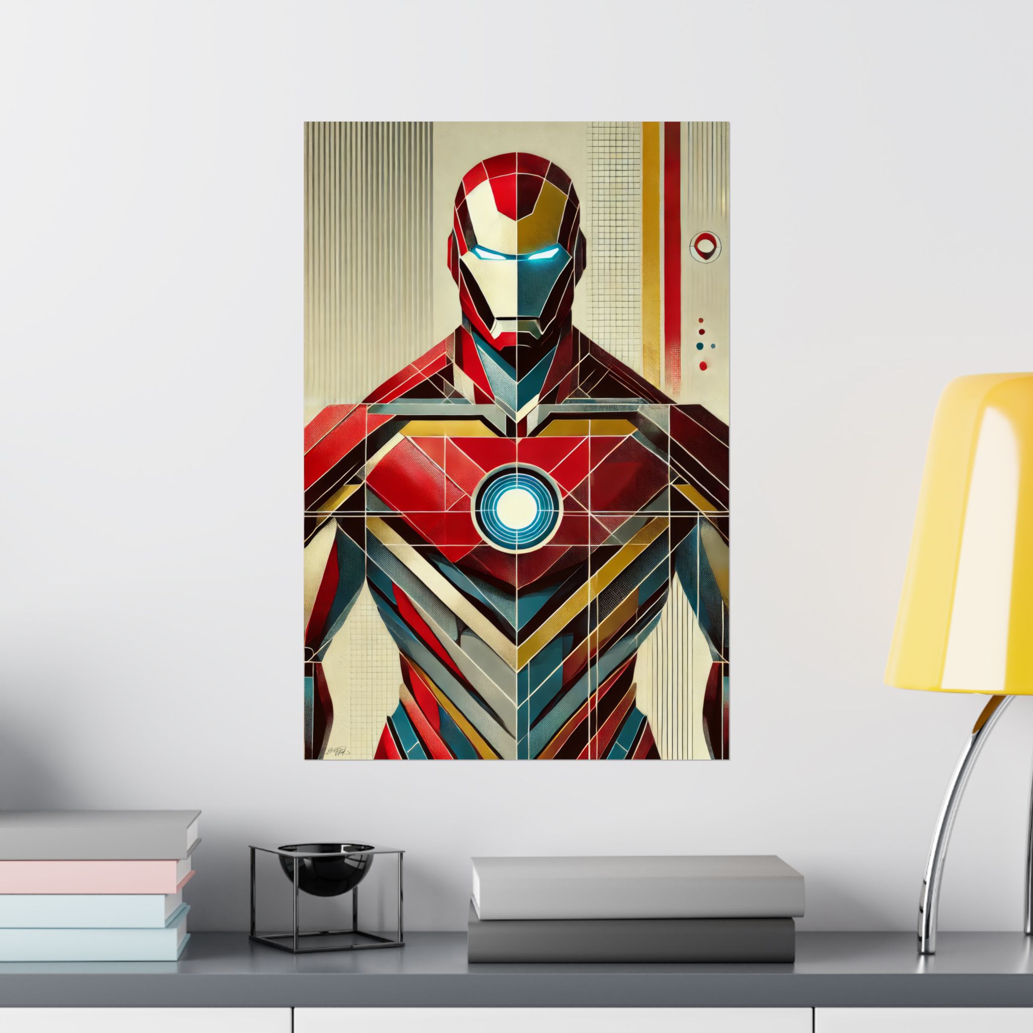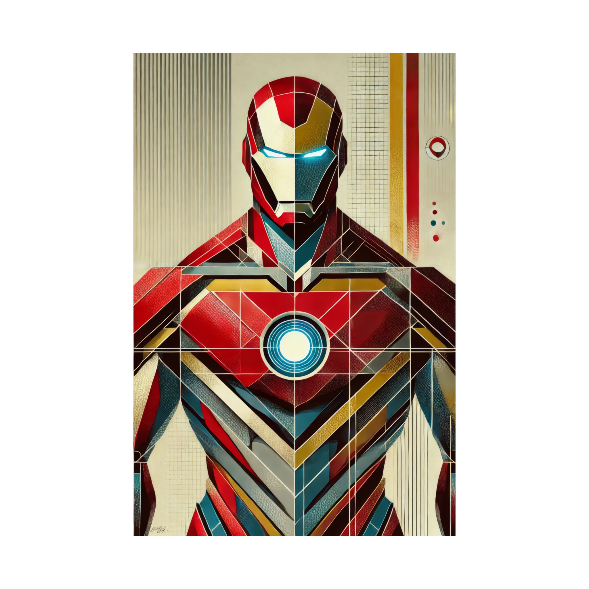 Iron Man Tony Stark Abstract Minimalist Wall Art Poster with a geometric Bauhaus Cubism design. This poster gives a modern and edgy vibe, perfect for Marvel fans or lovers of abstract art. Ideal for decorating a home office, man cave, or entertainment room. Great for birthdays, holidays, or any special occasion.
