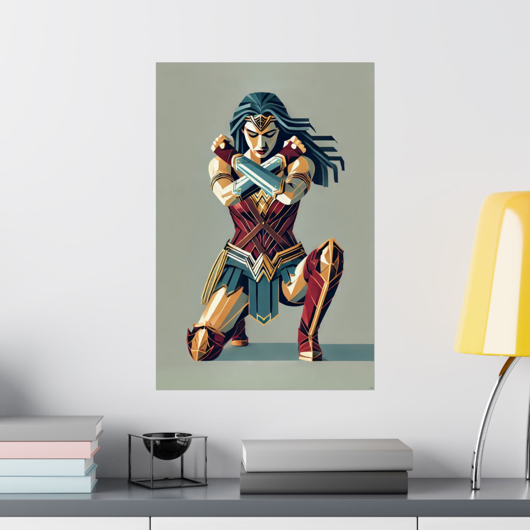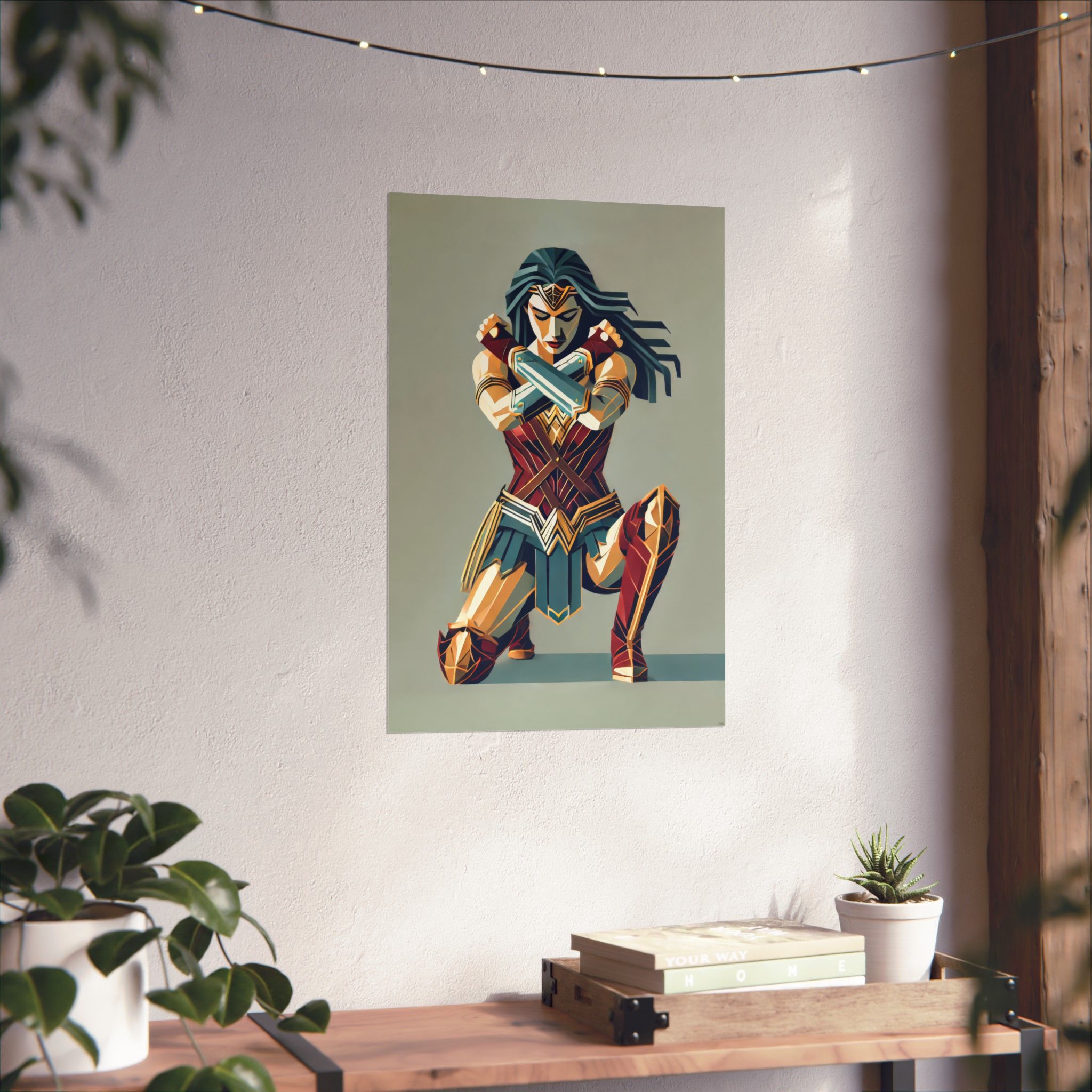 A matte vertical poster that brings a bold, modern take on a legendary heroine into your living space. Printed on museum-grade archival paper with giclée inks, the artwork’s deep, saturated colors stay vivid while the matte finish absorbs glare for a refined, gallery-style look. The stylized warrior kneels in a moment of quiet strength —…