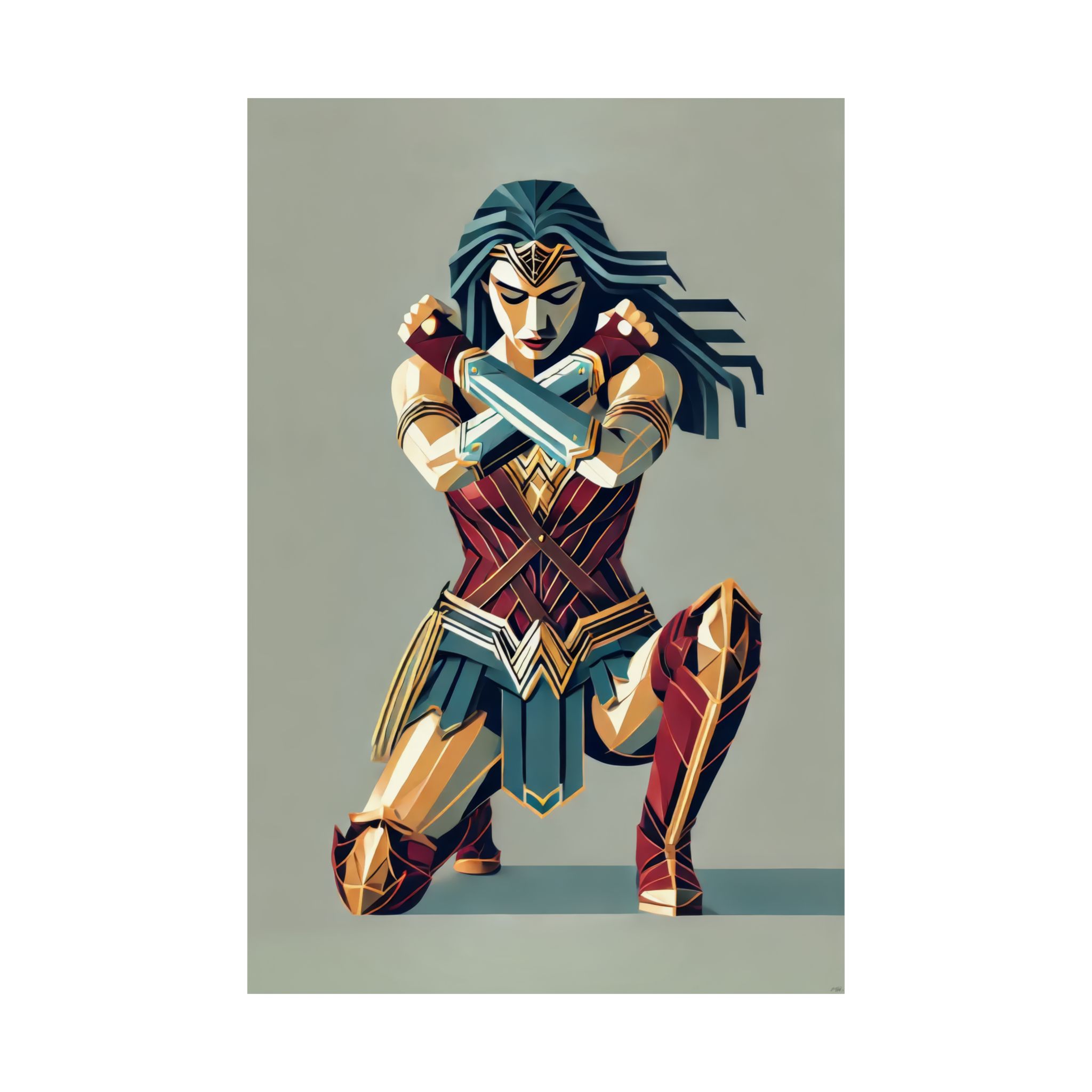 A matte vertical poster that brings a bold, modern take on a legendary heroine into your living space. Printed on museum-grade archival paper with giclée inks, the artwork’s deep, saturated colors stay vivid while the matte finish absorbs glare for a refined, gallery-style look. The stylized warrior kneels in a moment of quiet strength — a scene that reads like a visual promise of courage and calm. Hang it in a studio, reading nook, or home gallery to add a confident, artful presence that feels both heroic and quietly personal.